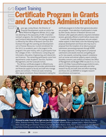 Certificate Program in Grants and Contracts Administration A year ago, Lesley Brown, the Director of Proposal Development, wrote an article for the Millennial Magazine (Winter 2013, page 33) attesting to the popularity of UNC Charlotte’s outreach programs, the Certificate Program in Grants and Contracts Administration. The training program is offered by the Office of Research Services and Outreach through the Learning and Development unit of Human Resources. Current enrollment for the 2013-14 academic year is the largest in the program’s five year history, with 23 participants from the Colleges of Arts + Architecture, Computing and Informatics, Education, Engineering, and Liberal Arts and Sciences. The remaining participants come from departments under Academic Services, Facilities Management, and the Graduate School. The 28-hour certificate program is offered to any UNC Charlotte employee who provides administrative and financial support to faculty and staff who manage grants and contracts. If there are seats remaining after regular enrollment, those interested in taking the