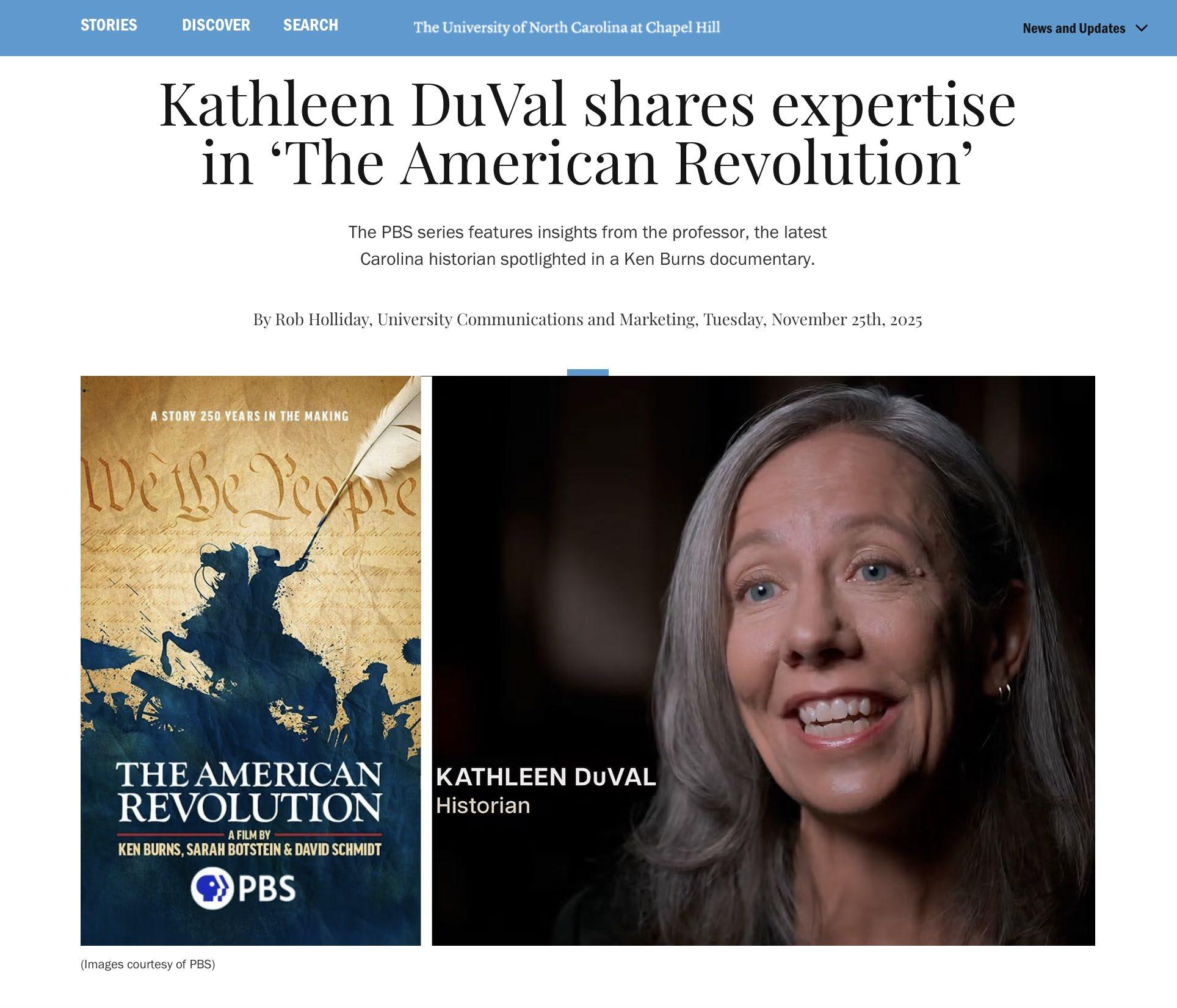 • Kathleen DuVal will appear in the upcoming Ken Burns documentary, The American Revolution.
