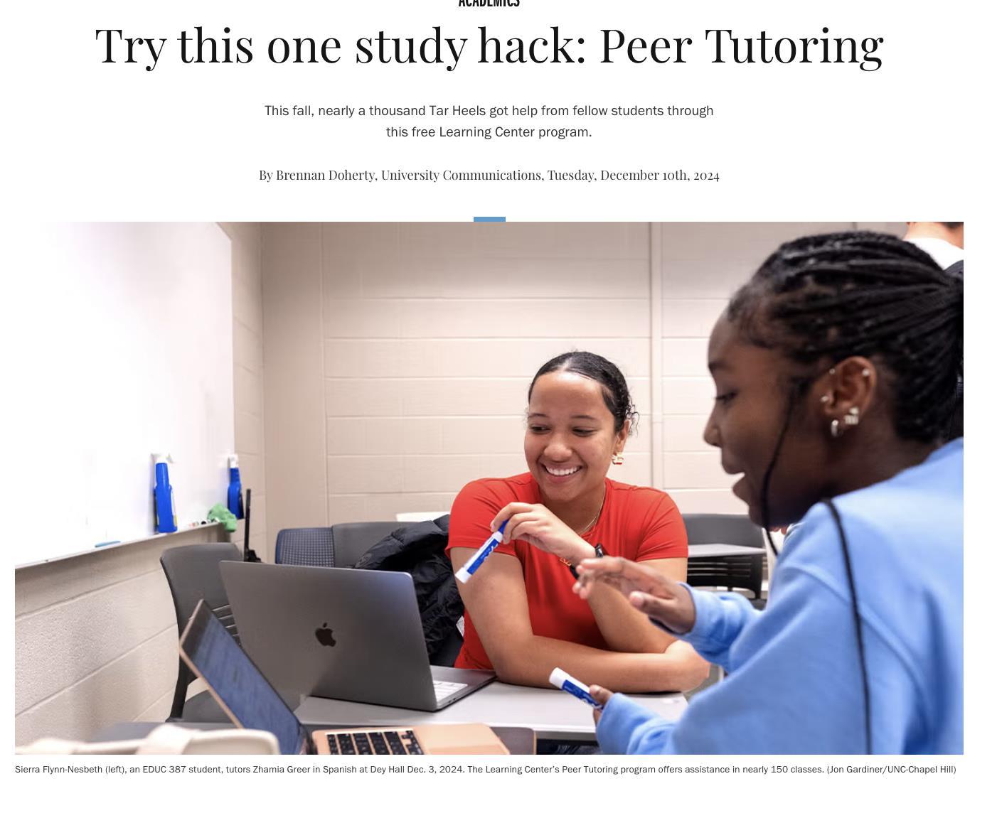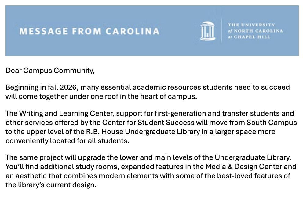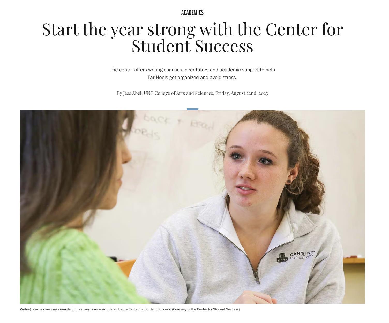 In 2019, the Writing and Learning Center became part of what is now known as the Center for Student Success, which also includes programs for incoming students (Summer Bridge), first-generation students (Carolina Firsts), transfer students and peer mentoring, all housed in the Student Academic Services Building on South Campus.