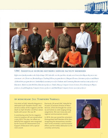 Previously, Jill served UNC Asheville for 10 years as assistant director of News dedicated to Jill Tompkins Yarnall, who served as editor of the magazine until her Services, where she brought her curiosdeath on April 20 after a brief but valiant ity and talents to wide-ranging writing assignments. She won many area and battle with cancer. She was 39. regional communications awards. A contributing writer for the magazine since its inception, Jill was named editor In 2010, she was named the university’s Distinguished Staff Member of the Year, in July 2010. This year, her efforts on recognizing her extraordinary contribubehalf of the magazine were recognized tions to the university’s communication by the Council for Advancement and efforts and her tireless dedication to the Support of Education with a special university community. merit award.