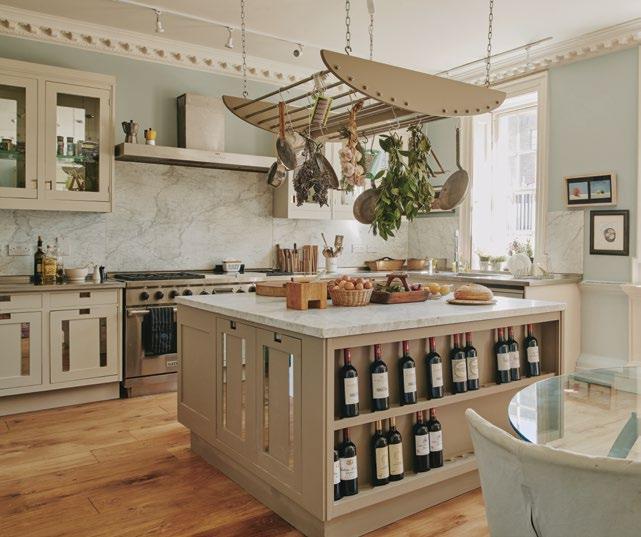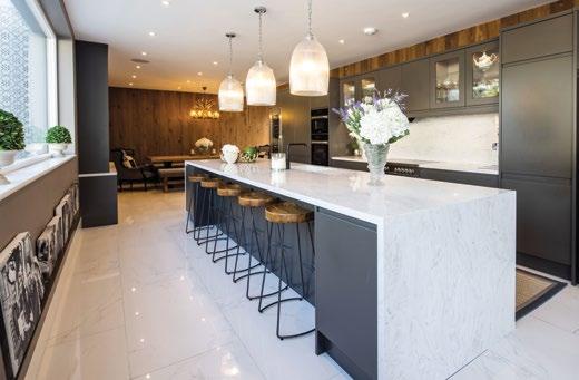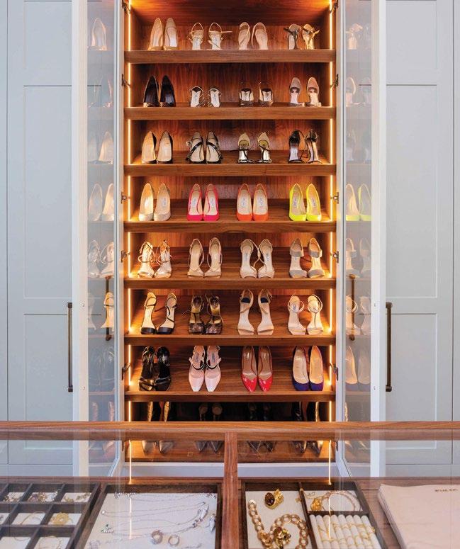 Backlit open shelving works well for displaying shoes or bags, while a solution more commonly found in the kitchen has migrated into dressing rooms. “An island can provide glass-covered storage to showcase jewellery or watches,” says Milns. “We often illuminate the contents, then incorporate extra storage underneath. Inserts in leather or suede are popular, and snakeskin can look incredible. e most outlandish storage we’ve created was in an Orient Express style, designed to look like vintage trunks.”