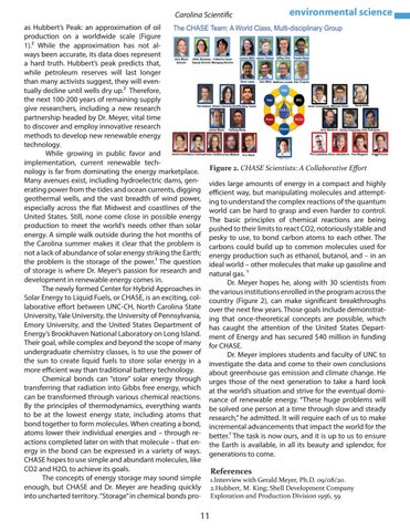 Carolina Scientific as Hubbert’s Peak: an approximation of oil production on a worldwide scale (Figure 1).2 While the approximation has not always been accurate, its data does represent a hard truth. Hubbert’s peak predicts that, while petroleum reserves will last longer than many activists suggest, they will eventually decline until wells dry up.2 Therefore, the next 100-200 years of remaining supply give researchers, including a new research partnership headed by Dr. Meyer, vital time to discover and employ innovative research methods to develop new renewable energy technology. While growing in public favor and implementation, current renewable technology is far from dominating the energy marketplace. Many avenues exist, including hydroelectric dams, generating power from the tides and ocean currents, digging geothermal wells, and the vast breadth of wind power, especially across the flat Midwest and coastlines of the United States. Still, none come close in possible energy production to meet the world’s needs other than solar energy. A simple walk outside during the hot months of the Carolina summer makes it clear that the problem is not a lack of abundance of solar energy striking the Earth; the problem is the storage of the power.1 The question of storage is where Dr. Meyer’s passion for research and development in renewable energy comes in. The newly formed Center for Hybrid Approaches in Solar Energy to Liquid Fuels, or CHASE, is an exciting, collaborative effort between UNC-CH, North Carolina State University, Yale University, the University of Pennsylvania, Emory University, and the United States Department of Energy’s Brookhaven National Laboratory on Long Island. Their goal, while complex and beyond the scope of many undergraduate chemistry classes, is to use the power of the sun to create liquid fuels to store solar energy in a more efficient way than traditional battery technology. Chemical bonds can “store” solar energy through transferring that radiation into Gibbs free energy, which can be transformed through various chemical reactions. By the principles of thermodynamics, everything wants to be at the lowest energy state, including atoms that bond together to form molecules. When creating a bond, atoms lower their individual energies and – through reactions completed later on with that molecule – that energy in the bond can be expressed in a variety of ways. CHASE hopes to use simple and abundant molecules, like CO2 and H2O, to achieve its goals. The concepts of energy storage may sound simple enough, but CHASE and Dr. Meyer are heading quickly into uncharted territory. “Storage” in chemical bonds pro-