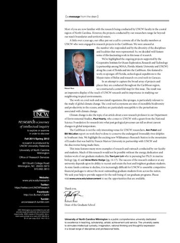Most of you are now familiar with the research being conducted by UNCW faculty in the coastal region of North Carolina. However, the projects conducted by our researchers range far beyond our state’s boundaries and territorial waters. A little over a year ago, our office put out a call to convene all of the faculty members at UNCW who were engaged in research projects in the Caribbean. We were amazed at the number who responded and by the diversity of the disciplines and localities that were represented. So, we decided we’d feature some of this fascinating work in this issue of re:search. We’ve highlighted the ongoing projects supported by the Cooperative Institute for Ocean Exploration, Research and Technology (a partnership among NOAA, Florida Atlantic University and UNCW) along the coast of Florida and into the Caribbean. Also featured is work on sponges off Florida, archeological expeditions to the Mayan ruins of Belize and research on coral reefs in Curacao. In an attempt to capture the broad array of projects and places they are conducted throughout the Caribbean region, Robert Roer we constructed a centerfold map for this issue. The result was an impressive display of the reach of UNCW research and its importance in studying our neighboring tropical environments. The work on coral reefs and associated organisms, like sponges, is particularly relevant to the study of global climate change. The coral reef ecosystems are sites of incredible biodiversity and productivity in the oceans, and they are particularly susceptible to the perturbations associated with climate change. Climate change is also the topic of an article about a new research professor in our Department of Environmental Studies, Paul Hearty, who comes to UNCW with a grant from the National Science Foundation for research into what past geological processes can tell us about current changes in global temperature. The Caribbean is not the only interesting venue for UNCW researchers. Ann Pabst and Bill McLellan report on work they’ve done to conserve the endangered Irrawaddy river dolphin in Southeast Asia. We highlight the exciting new Wildsumaco Research Station in the mountains of Ecuador that was built by Francis Marion University in partnership with UNCW and the discoveries being made there. This issue features many more examples of research and outreach conducted by our faculty and students. Much of this research would not be possible without the energy, dedication and tireless work of our graduate students, like Tse-Lynn Loh who is pursuing her Ph.D. in marine biology (pg. 4) and Anne-Marie Hodge (pg. 14-17). The success of the research endeavor at any university depends upon its ability to recruit and retain the best and brightest graduate students. As state funds continue to decline, it is increasingly difficult for UNCW to assemble competitive financial packages to attract the most outstanding graduate students from across the nation. We seek your help to provide support for the well-being of our graduate programs. Please visit www.uncw.edu/advancement to see the opportunities that are available. Thank you.