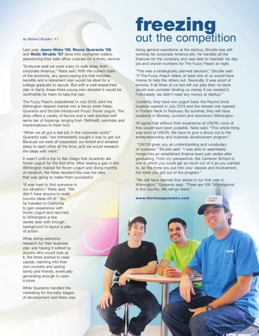 out the competition doing general operations at the startup, Struble was still working his corporate America job. He handles all the finances for the company and was able to maintain his day job and crunch numbers for The Fuzzy Peach at night. “This was a strategically planned decision,” Struble said. “If The Fuzzy Peach failed, at least one of us would have money to help the others out. Secondly, it was proof of income. If all three of us had left our jobs then no bank would ever consider lending us money if we needed it. Fortunately, we didn’t need any money at startup.” Currently, they have two yogurt bars: the Racine Drive location opened in July 2010 and the newest one opened in Porters Neck in February. By summer, they will have locations in Monkey Junction and downtown Wilmington. All agree that without their experience at UNCW, none of this would have been possible. Nista said, “This whole thing was born at UNCW. We have to give a shout out to the entrepreneurship and business development program.” “UNCW gives you an understanding and vocabulary of business,” Struble said. “I was able to seamlessly merge into an established finance team just weeks after graduating. From my perspective, the Cameron School is one in which you could get as much out of it as you wanted to, so the more you put into your classes and involvement, the more you got out of the program.” “We will have opened four stores in our first year in Wilmington,” Quaranto said. “There are 100 ‘Wilmingtons’ in the country. We will go there.” w w w.thefuzzypeachnc.com