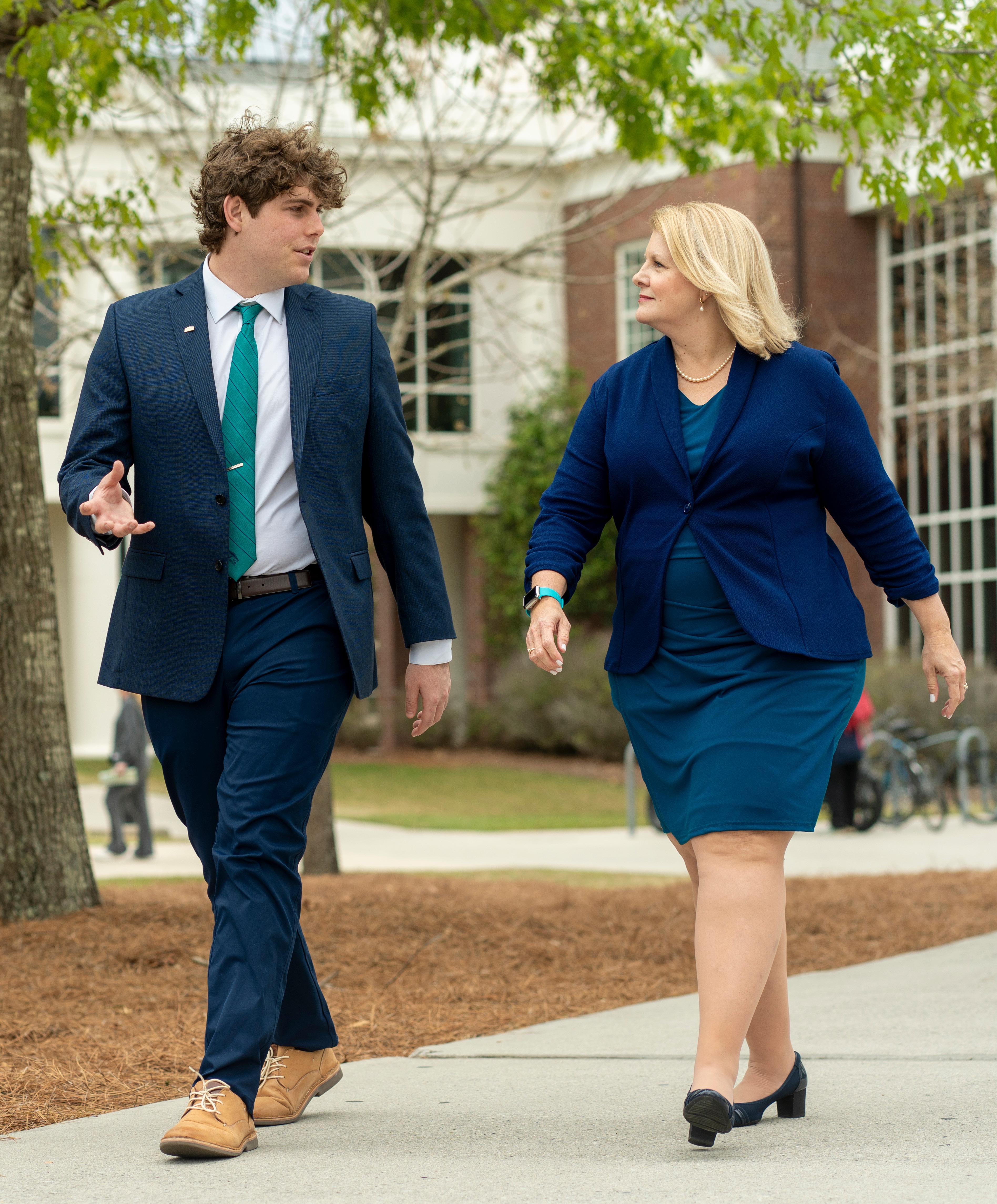 UNCW’s new Vice Chancellor for Student Affairs Christine Reed Davis and recently elected Student Body President Skyler Stein ’26 have something in common—a passion for putting students first. Stein was elected the new student body president in March 2024, and Davis was named the new vice chancellor in January 2024. They sat down in the Golden Hawk Room and had a conversation about student engagement, their hopes while in their positions and life at UNCW.