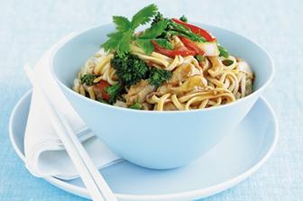 fydd y nwdls yn barod, draeniwch a'u rinsio a'u hychwanegu i'r tro ffrio.