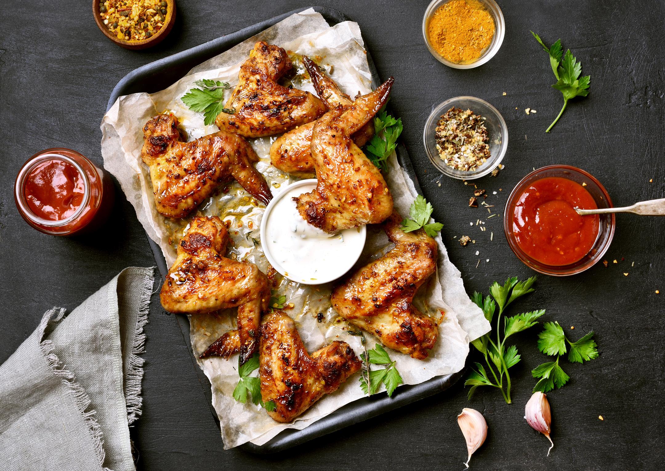 Paratowch y barbeciw ar gyfer coginio anuniongyrchol trwy fancio'r glo i un ochr fel bod ochr boeth ac ochr oerach. Ar gyfer y saws iogwrt, cymysgwch y garlleg gyda'r sudd lemwn mewn powlen a'i roi i un ochr. Cyfunwch y sbeisys, yr halen a'r pupur mewn powlen Trowch yr adenydd gyda 3 llwy fwrdd o'r gymysgedd hon mewn powlen arall. Coginiwch yr adenydd ar ochr oerach y barbeciw, gyda'r caead drostynt, am 30 munud, gan eu troi hanner ffordd drwy’r broses. Symudwch yr adenydd i wres uniongyrchol, dros y glo, a'u coginio am 5 munud arall, gan eu symud a'u troi i wneud yn siŵr eu bod yn crimpio'n gyfartal. (Fel arall, cynheswch y popty i 180C/ffan 160C/nwy 6 a rhennwch yr adenydd rhwng dwy badell. Rhostiwch am 45 munud nes eu bod wedi'u coginio drwyddynt. Cynheswch y gril ar wres uchel a throsglwyddwch yr adenydd i badell fawr, gan daflu unrhyw sudd coginio Griliwch am 15 20 munud, gan eu troi bob 3 4 munud, nes eu bod wedi'u gridyllu ac yn grimp.) Gorffennwch saws iogwrt trwy straenio'r gymysgedd lemwn a garlleg trwy ridyll i mewn i'r iogwrt gyda phinsiad o halen a'i gymysgu'n dda. Trowch yr adenydd yn y gymysgedd sbeis sy'n weddill ac yna'u rhoi ar ddysgl a diferu ychydig o'r saws iogwrt drostynt, gan weini gweddill y saws fel saig drochiTaenwch yr oregano drostynt a'u gweini