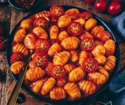 DULL 1. 2. 3. 4 5. 6. 400g o Gnocchi 1 nionyn bach 1-2 ewin o arlleg 1 llwy fwrdd o olew olewydd Halen, pupur, siwgr Perlysiau Eidalaidd 100g o domatos ceirios CYNHWYSION Gnocchi mewn saws tomato F E G A N AWGRYMIADAU Mae'n blasu orau ar ôl diwrnod hir o sglefrio. Rysáit gan Skate Barod mewn 10 munud Digon i 2 o bobl