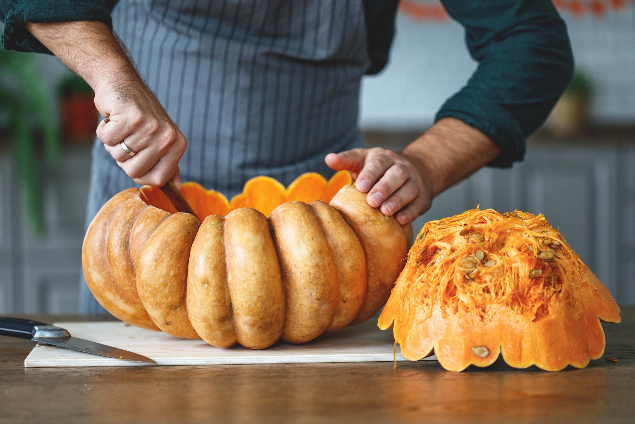2. Tociwch ben y bwmpen. Tynnwch y perfeddion a'r hadau (mae'r hadau'n gwneud byrbryd braf os byddwch yn eu sychu am ddiwrnod ac yna'u rhostio gyda phaprica mwg, cwmin a halen) a llwywch y cnawd (sgŵp hufen iâ sy'n gweithio orau) i ffurfio cudynnau tenau. (Os ydych am bobi yn y bwmpen, lapiwch hi mewn ffoil a'i rhoi ar ddysgl bobi).