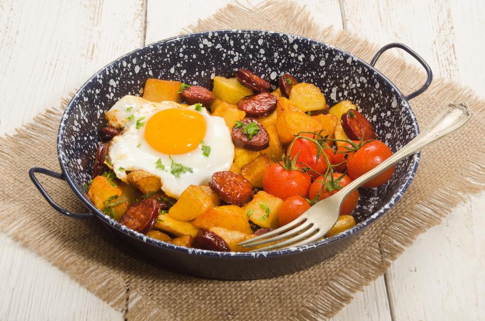 ewn m 10 rdd ynu y p p , y y , y g g chorizo, eu gorchuddio a'u coginio am 15 munud, gan gymysgu'nachlysurol i'w hatal rhag glynu Pan fo 5 munud ar ôl, torrwch yr wyau i badell ffrio a'u coginio, gan ychwanegu halen a phupur i roi blas Rhowch yr wyau ar ben y gymysgedd a'i weini 4. 5. rizo 2 ewin o arlleg 6 owns o chorizo 3 taten fawr, wedi'u torri'n giwbiau bach 1 llwy fwrdd o fenyn heb ei halltu Halen a phupur 4 wy 2 bupur 1 nionyn CYNHWYSION Ychwanegwch bersli a phupur garlleg am fymryn bach o gic Mae paprica'n gweddu hefyd AWGRYMIADAU C I G Rysáit gan Rygbi Undeb Merched Barod mewn 30 40 munud Digon i 4 o bobl