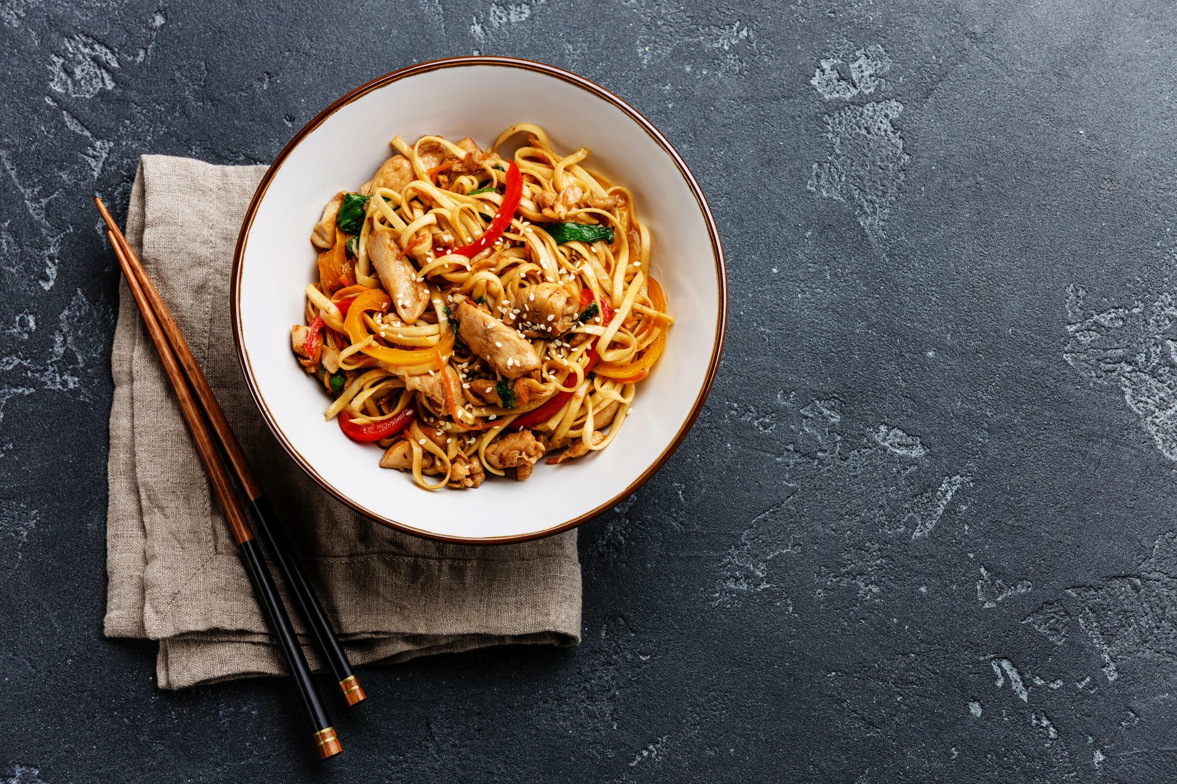 Rhowch sosban fawr o ddŵr gyda phinsiad o halen i ferwi ar gyfer y nwdls Rhowch y cyw iâr wedi'i dorri'n giwbiau mewn powlen gymysgu. Ysgeintiwch y pum sbeis