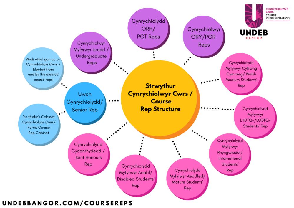 Mae’r strwythur cynrychiolwyr cwrs wedi'i drefnu er mwyn sicrhau bod llais pob myfyriwr yn cael ei glywed. Mae hyn yn golygu, yn ogystal â'n cynrychiolwyr rhaglenni arferol, ein bod wedi cyflwyno cynrychiolwyr mewn meysydd lle adroddodd myfyrwyr eu bod yn teimlo eu bod yn cael eu tangynrychioli. Edrychwch ar y disgrifiadau swydd isod am ragor o wybodaeth.
