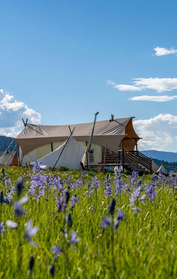 mountains and ranchland, with over a mile of pristine riverfront, our Big Sky camp offers world-class fly fishing and scenic float tours just steps from your tent. It also offers easy access to hiking, horseback riding, and wildlife viewing in the nearby Lamar Valley—known as “America’s Serengeti” for its easy-to-spot