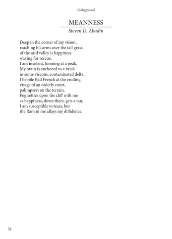 MEANNESS Steven D. Abadin Deep in the corner of my vision, reaching his arms over the tall grass of the arid valley is happiness waving for rescue. I am insolent, looming at a peak. My brain is anchored to a brick in some viscous, contaminated delta. I babble Bad French at the eroding visage of an orderly court, palimpsest on the terrain. Fog settles upon the cliff with me as happiness, down there, gets a tan. I am susceptible to tears, but the Ram in me allays my diffidence.