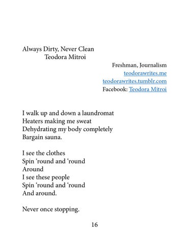 I walk up and down a laundromat Heaters making me sweat Dehydrating my body completely Bargain sauna. I see the clothes Spin ‘round and ‘round Around I see these people Spin ‘round and ‘round And around. Never once stopping. 16