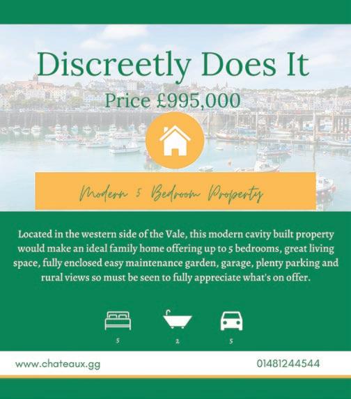 £415,000 £375,000 • Modern one bedroom house, built 6 years ago. • Situated with in walking distance of The Bridge and all its amenities. • Open plan kitchen/lounge/diner, cloakroom and glazed porch. • Double bedroom with fitted furniture and fully tiled shower room. • Allocated brick paved parking for one car and front garden. • Perry’s Guide - Page 10 D2 • A well presented ground floor apartment. • Ideally situated for The Bridge and it’s amenities. • 2 good double bedrooms with built in wardrobes and bathroom. • Generous lounge/diner with opening to kitchen. • Good on street parking nearby. • Perry’s Guide - Page 11 E3 St Sampson TRP: 76 Ref: 1893 St Sampson TRP: 88 Ref: 1855 £475,000 St Martin TRP: 72 Ref: 1842 • 2 bedroom bungalow on a quiet Clos. • Situated in St Martins, just a short walk to St Martins Village. • Lounge, kitchen/diner, bathroom & double and single bedrooms. • Appealing to anyone looking for a small project. • Fully enclosed rear patio garden and parking to front. Perry’s Guide - Page 30 C1 £635,000 St Peter Port TRP: 89 Ref: 1847 • Immaculately presented 2 bedroom, ground floor apartment. • Situated in the desirable Vega development. • Great location for all the Town amenities with secure parking. • Large bedroom with en suite shower, fitted robes and additional double bedroom. • Open plan kitchen/lounge/dining room with balcony, utility and bathroom. Perry’s Guide - Page 17 G2 Tel: 244544 www.chateaux.gg David, Brian, Matthew & Clare would like to wish all their clients, past, present & future a very Merry Christmas and a Prosperous New Year! DECEMBER 2022 PAGE 24