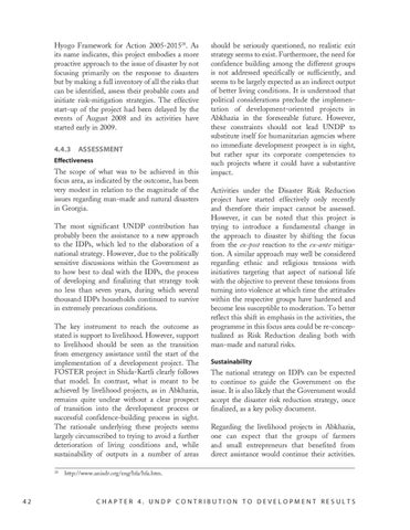should be seriously questioned, no realistic exit strategy seems to exist. Furthermore, the need for confidence building among the different groups is not addressed specifically or sufficiently, and seems to be largely expected as an indirect output of better living conditions. It is understood that political considerations preclude the implementation of development-oriented projects in Abkhazia in the foreseeable future. However, these constraints should not lead UNDP to substitute itself for humanitarian agencies where no immediate development prospect is in sight, but rather spur its corporate competencies to such projects where it could have a substantive impact. Activities under the Disaster Risk Reduction project have started effectively only recently and therefore their impact cannot be assessed. However, it can be noted that this project is trying to introduce a fundamental change in the approach to disaster by shifting the focus from the ex-post reaction to the ex-ante mitigation. A similar approach may well be considered regarding ethnic and religious tensions with initiatives targeting that aspect of national life with the objective to prevent these tensions from turning into violence at which time the attitudes within the respective groups have hardened and become less susceptible to moderation. To better reflect this shift in emphasis in the activities, the programme in this focus area could be re-conceptualized as Risk Reduction dealing both with man-made and natural risks. Sustainability