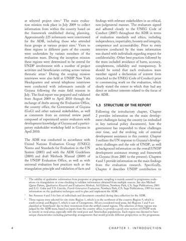 at selected project sites.4 The main evaluation mission took place in July 2009 to collect information from within the country based on the framework established during planning. Approximately 225 informants were interviewed for the ADR, including those who attended focus groups at various project sites.5 Visits to three regions in different parts of the country were undertaken by various members of the evaluation team. During the inception mission these regions were determined to be central for UNDP involvement with a number of project activities and beneficiaries cutting across various thematic areas.6 During the scoping mission interviews were also held at UNDP New York Headquarters and several telephone interviews were conducted with informants outside of Guyana following the main field mission in July. The final report was prepared and validated from August 2009 to April 2010 through the exchange of drafts among the Evaluation Office, the country office, the Government of Guyana (GoG) and other national stakeholders, as well as comments from an external review panel composed of experienced senior evaluators with development knowledge of Guyana and a participatory stakeholder workshop held in Guyana in April 2010. The ADR was conducted in accordance with United Nations Evaluation Group (UNEG) Norms and Standards for Evaluation in the UN System (2005) and with the ADR Guidelines (2009) and draft Methods Manual (2009) of the UNDP Evaluation Office, as well as with universal evaluation best practices such as the triangulation principle and validation of facts and