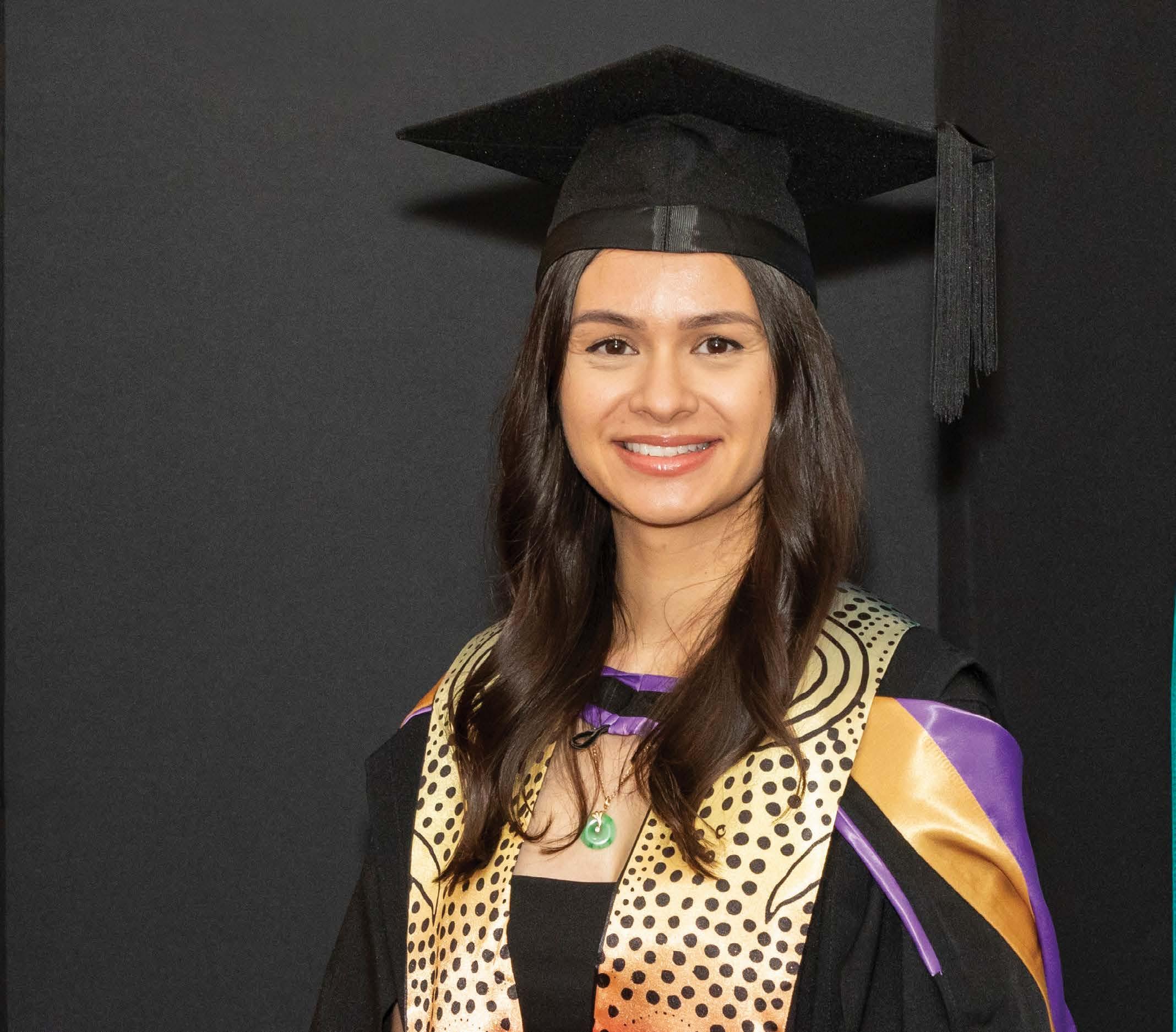 Liv Joyce is a proud Anaiwan woman and mother, born and raised in Armidale. This artwork honours the university’s place on Anaiwan Country and acknowledges the many Aboriginal and Torres Strait Islander communities whose knowledge and stories continue to guide its path. It reflects the idea that UNE is shaped not only by the Country it stands on, but by the students and staff whose ties to Country and community reach far and wide. At its heart, this piece is a celebration of belonging, honouring the community you come from while taking pride in becoming part of the UNE community.