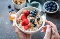 Healthy eating: entrees, fruit, yogurt, granola, frozen smoothies