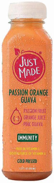 Passion Orange Guava—Orange, Pink Guava Puree, Pears, Pineapple, Passion Fruit, Purified Water, Acerola Cherries.