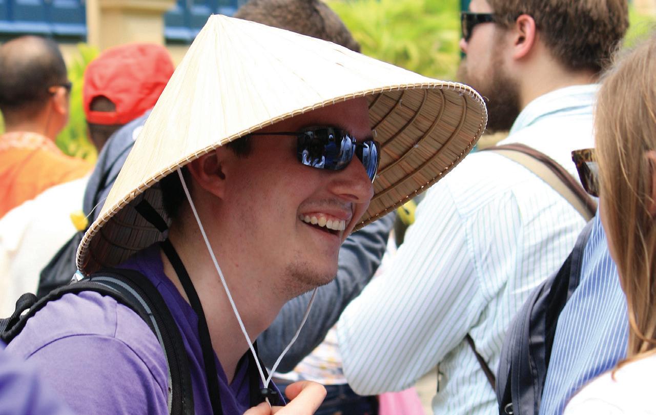 A student wearing a traditional Asian hat. Photo Credit: Gregory Merz