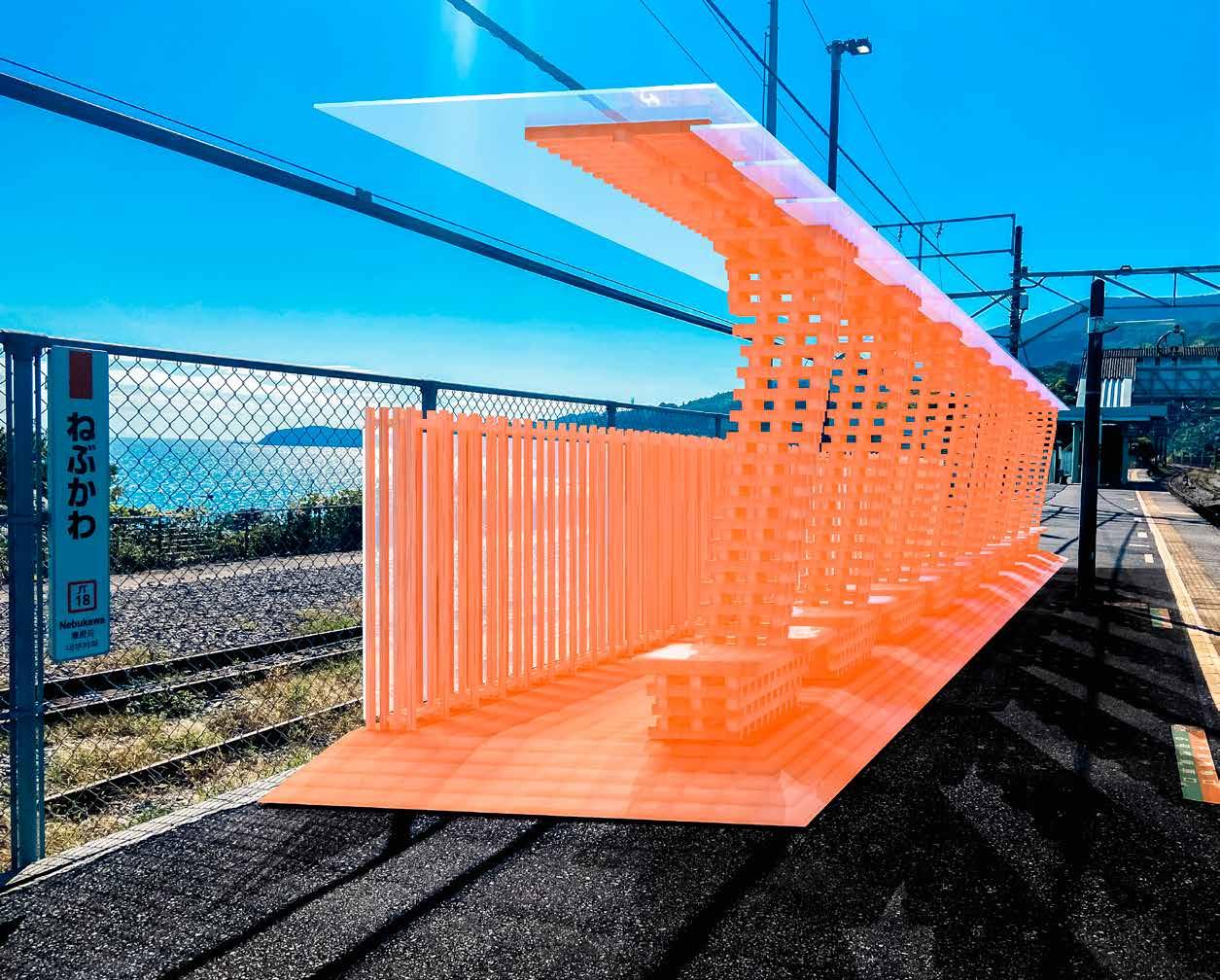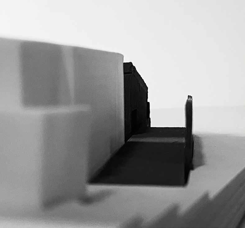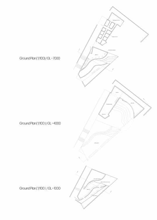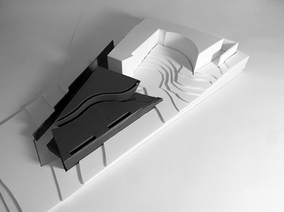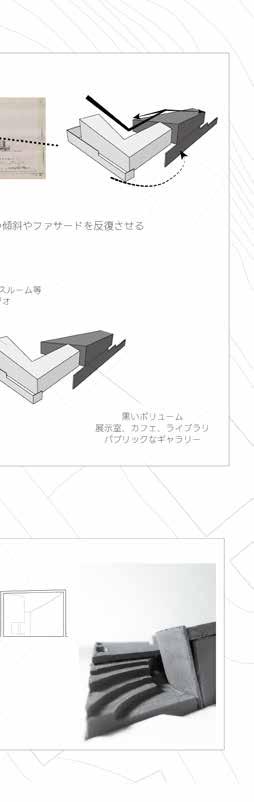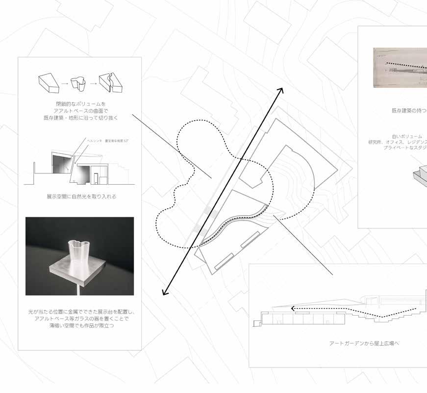 周囲の環境や既存建築からボリュームを立ち上げ、アア ルトベースの持つなだらかな曲面でボリュームにスリッ トを作り、自然光を用いて作品を展示する計画で制作し た作品。
