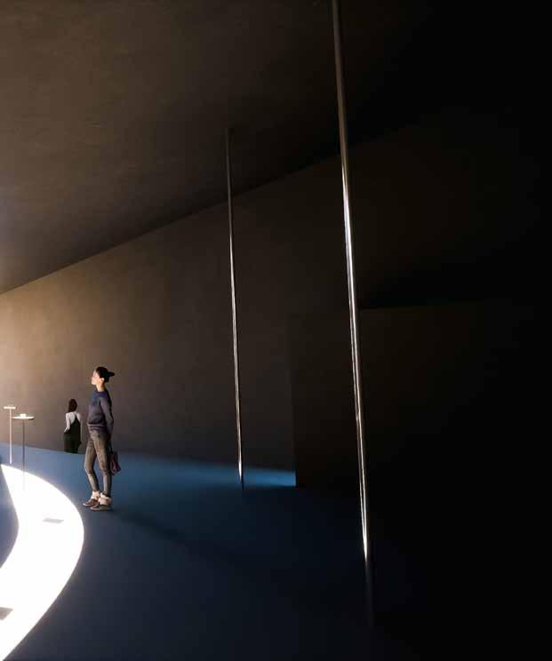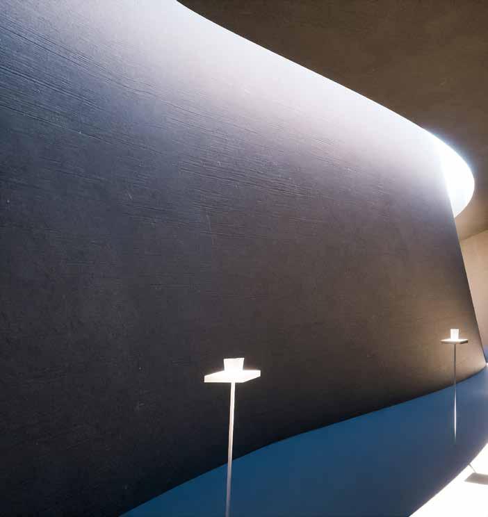 曲面壁に沿って開いている天井のスリットからギャラリー空間に光が差し込む