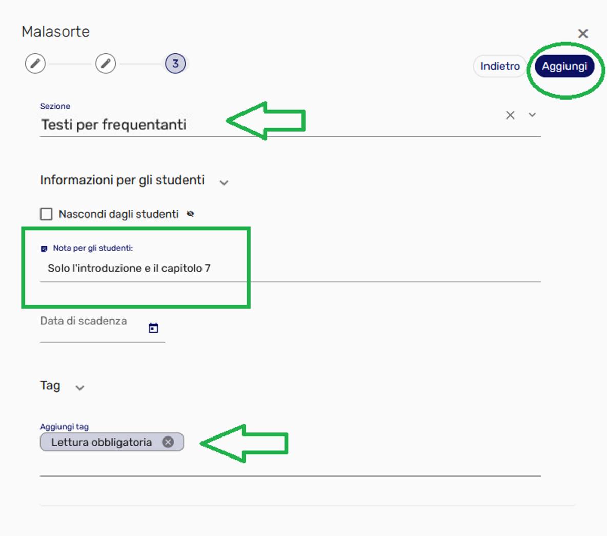 4. Selezionare la sezione in cui si vuole aggiungere il riferimento bibliografico e aggiungere eventuali indicazioni aggiuntive nel campo Nota pubblica. È possibile inoltre assegnare un tag (Es.: Lettura obbligatoria ). Il campo Data di scadenza NON DEVE essere compilato Cliccare su Aggiungi.