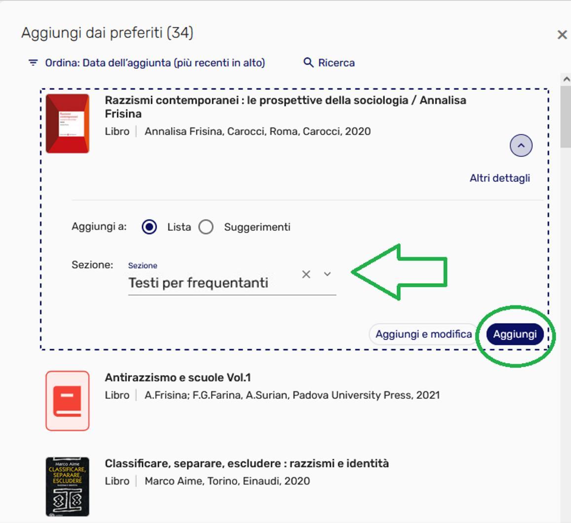 2. Individuare il titolo e selezionare la sezione in cui si intende inserirlo. Cliccare su Aggiungi:
