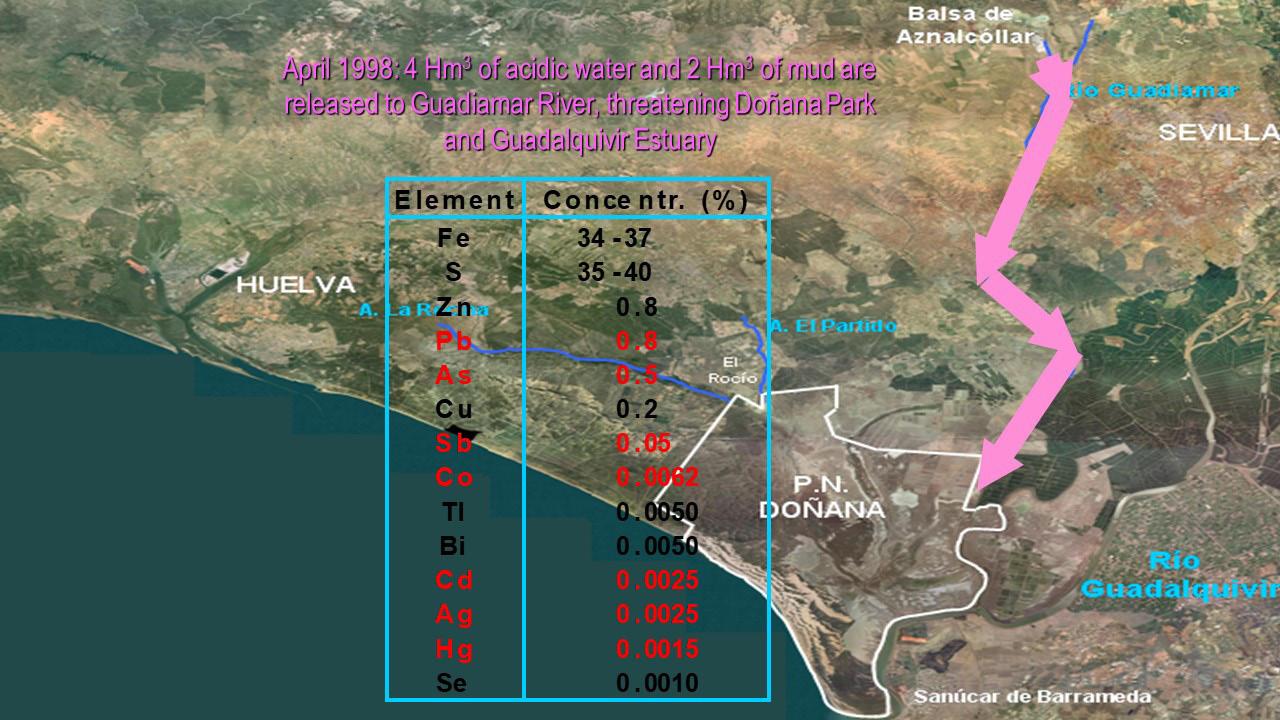 Cuantitativa y cualitativamente, el derrame de la balsa minera de Aznalcóllar constituye el mayor desastre contaminante terrestre en toda la historia de España, afectando al entorno del Parque de Doñana, la mayor reserva de aves de Europa. 6 millones de m3 vertidos de aguas y lodos ácidos cargados de metales pesados carcinogénicos, neurotóxicos, teratogénicos,… (16.000 toneladas de plomo, 10.000 de ar-