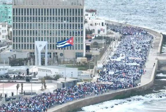 Este año no iba a ser menos y recientementese llevó a cabo una gran marcha de apoyo a la revolución y denuncia del bloqueo y las sanciones que el imperialismo impone al proyecto cubano, y más aun después de la jugada de Biden que en un movimiento testimonial y efímero que a días de acabar su mandato anunció la retirada de Cuba de la Lista de Estados Patrocinadores del Terrorismo, una decisión que pudiera aliviar parcialmente el estrangulamiento económico que sufre la isla. Un espejismo que Donald Trump se apresuró a disolver nada más jurar el cargo y anunció que revertía esta y el resto medidas adoptadas por su predecesor, intensificando de nuevo las sanciones contra Cuba y se prevén más.