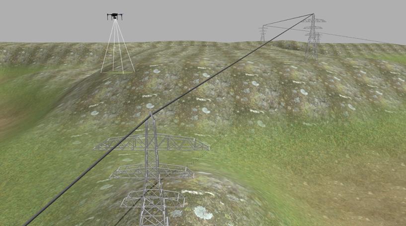 A validação desse algoritmo, foi feita com auxílio de um simulador, uma vez que é crucial que esse desenvolvimento seja pautado em um ambiente controlado e que não ofereça riscos. Ademais, para um teste em uma linha de transmissão real seria necessário o aval da concessionária responsável, o que pode envolver burocracia e limitações operacionais para esse trabalho. Nesse sentido, um ambiente virtual foi montado especificamente para a realização da missão proposta: um VANT autônomo sobrevoando uma linha de transmissão para inspecioná-la. Para isso, um mapa fictício foi desenvolvido no simulador Gazebo, simulador de robótica de código aberto que permite a criação de ambientes virtuais realistas, integrando física e sensores A figura a seguir mostra uma parte do ambiente virtual criado para os testes. Espera-se como resultado que tal aplicação seja capaz de aumentar a confiabilidade da inspeção de linhas de transmissão através da padronização e automação.