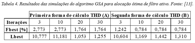 Nesta aplicação, o objetivo era realizar a alocação ótima de um filtro ativo shunt (que injeta correntes de compensação) com o intuito de minimizar distorção harmônica do sistema. Assim, as partículas do GSA foram modeladas como os locais potenciais para instalação do equipamento (posições das barras) e a função objetivo foi considerada como a média dos valores de distorção harmônica total (do inglês, total harmonic distortion – THD) de tensão e corrente das barras do sistema.