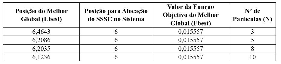 Assim, o algoritmo GSA desenvolvido foi aplicado ao sistema Testaram-se valores diferentes de partículas e todas chegaram na posição ótima correspondente à linha 6, conforme esperado, como mostra a Tabela 2. A Figura 6 ilustra um exemplo de execução do script desenvolvido, ilustrando a evolução da função objetivo associada ao melhor global ao longo das iterações, onde se pode notar o processo de minimização das perdas.