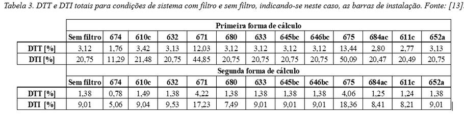 A Tabela 3 apresenta os resultados de THD obtidos com o processo de busca exaustiva Pode-se notar que a instalação na posição 674 foi a opção que resultou em menor distorção harmônica para o sistema, considerando-se as duas formas de cálculo.