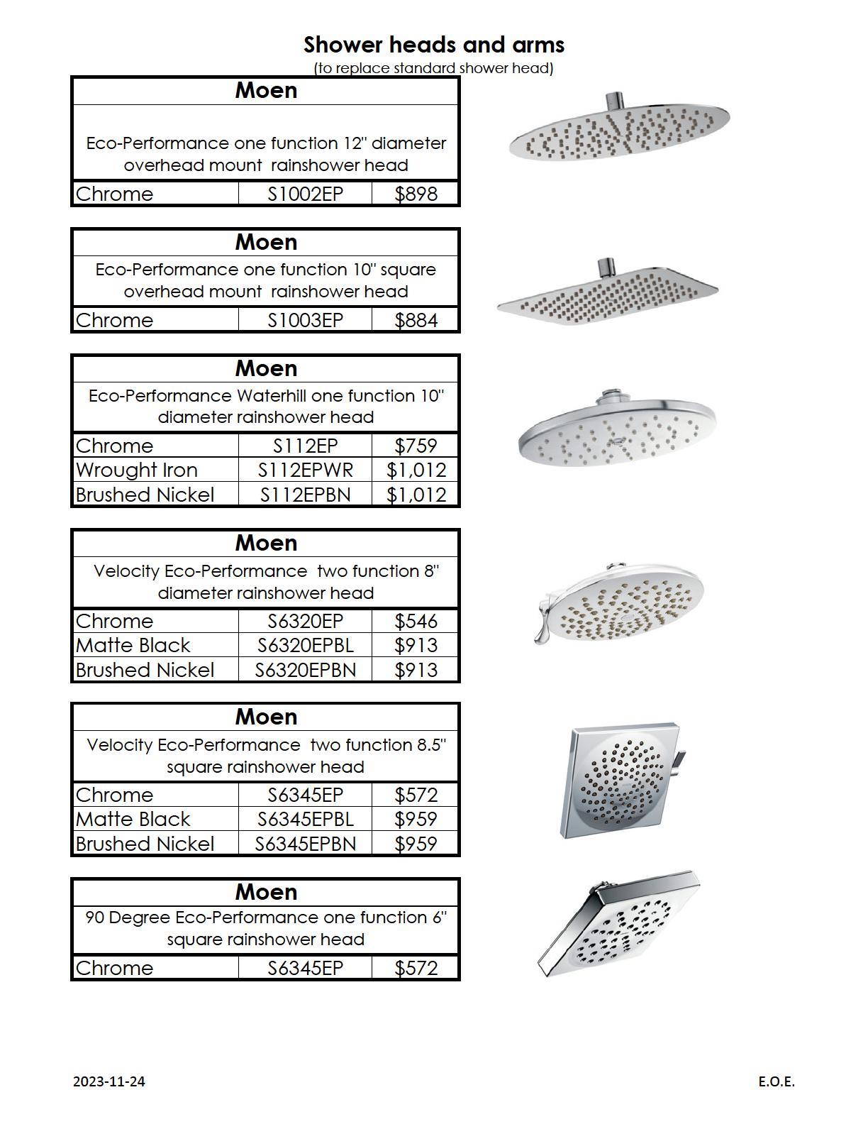 ADD Eco-Performance Handshower c/w bar; Four-function 4" spray head, 69" hose, 30" bar, Grohe drop elbow with control and diverter on same plate. Added to standard shower head.