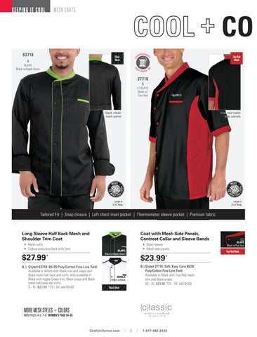 B | Style# 27718: Soft, Easy Care 65/35 Poly/Cotton Fine Line Twill Available in Black with True Red mesh, trim and Black snaps. XS - XL: $23.99 *2X - 3X: add $4.00