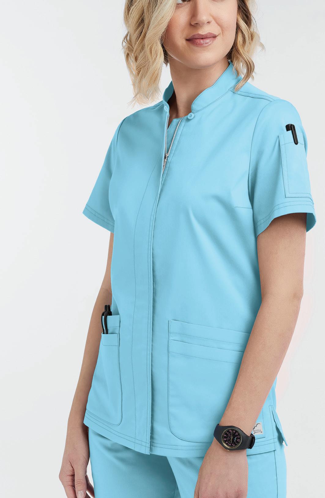 V-neck, silver nickel grommets, back darts and side vents. 4 front patch pockets. Shown in Poolside View BSS 754