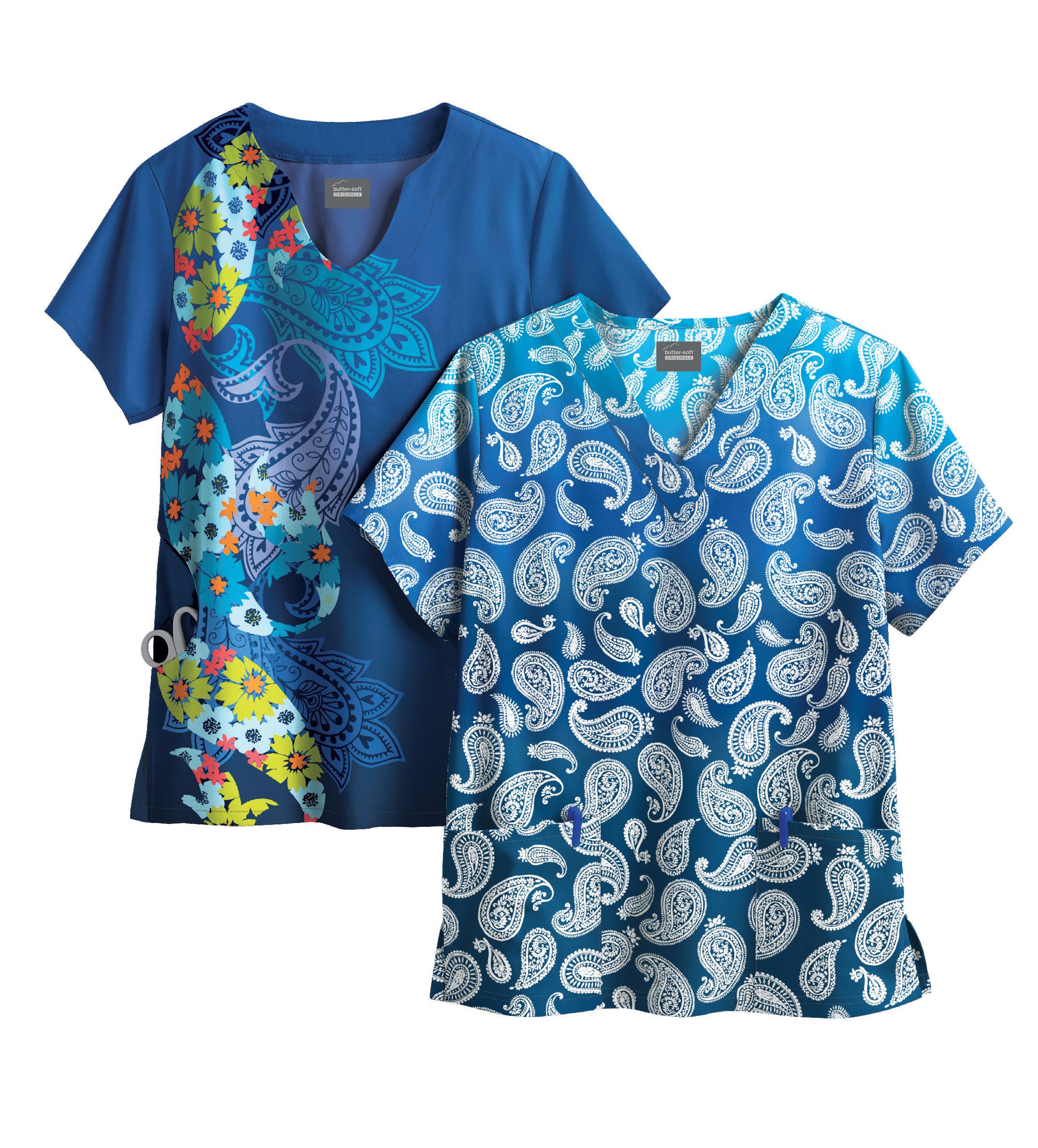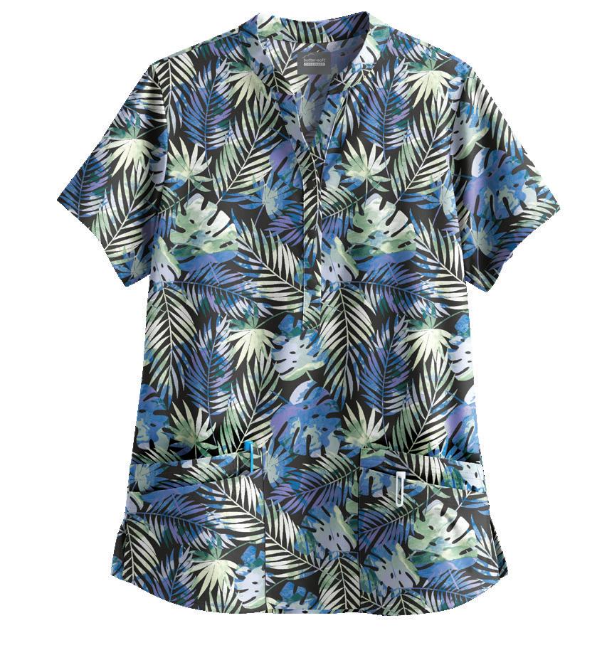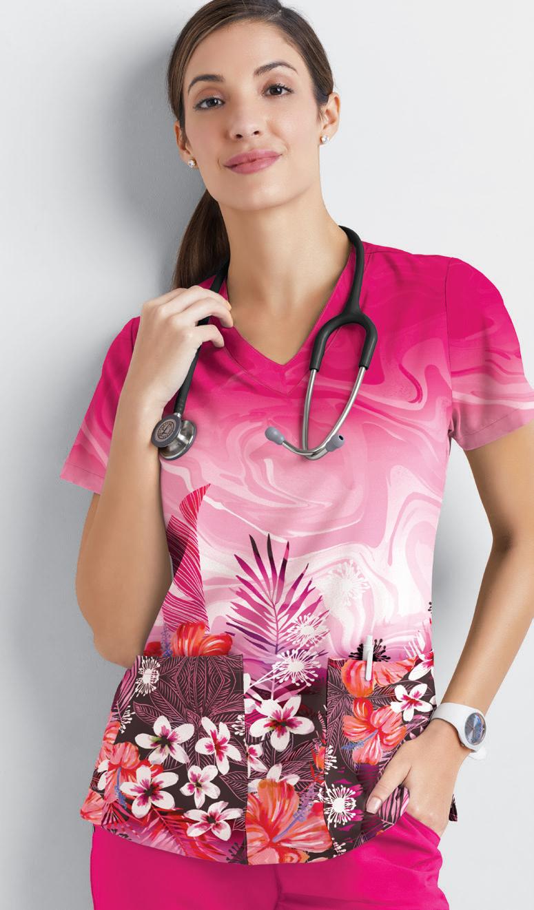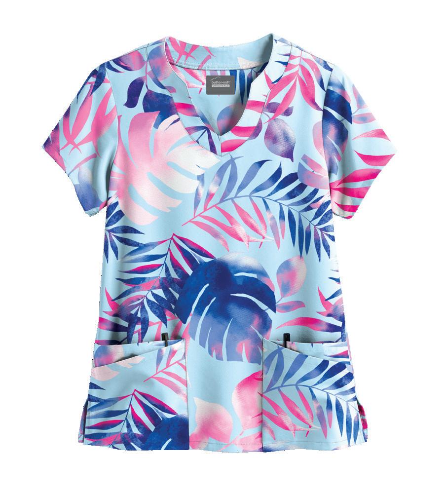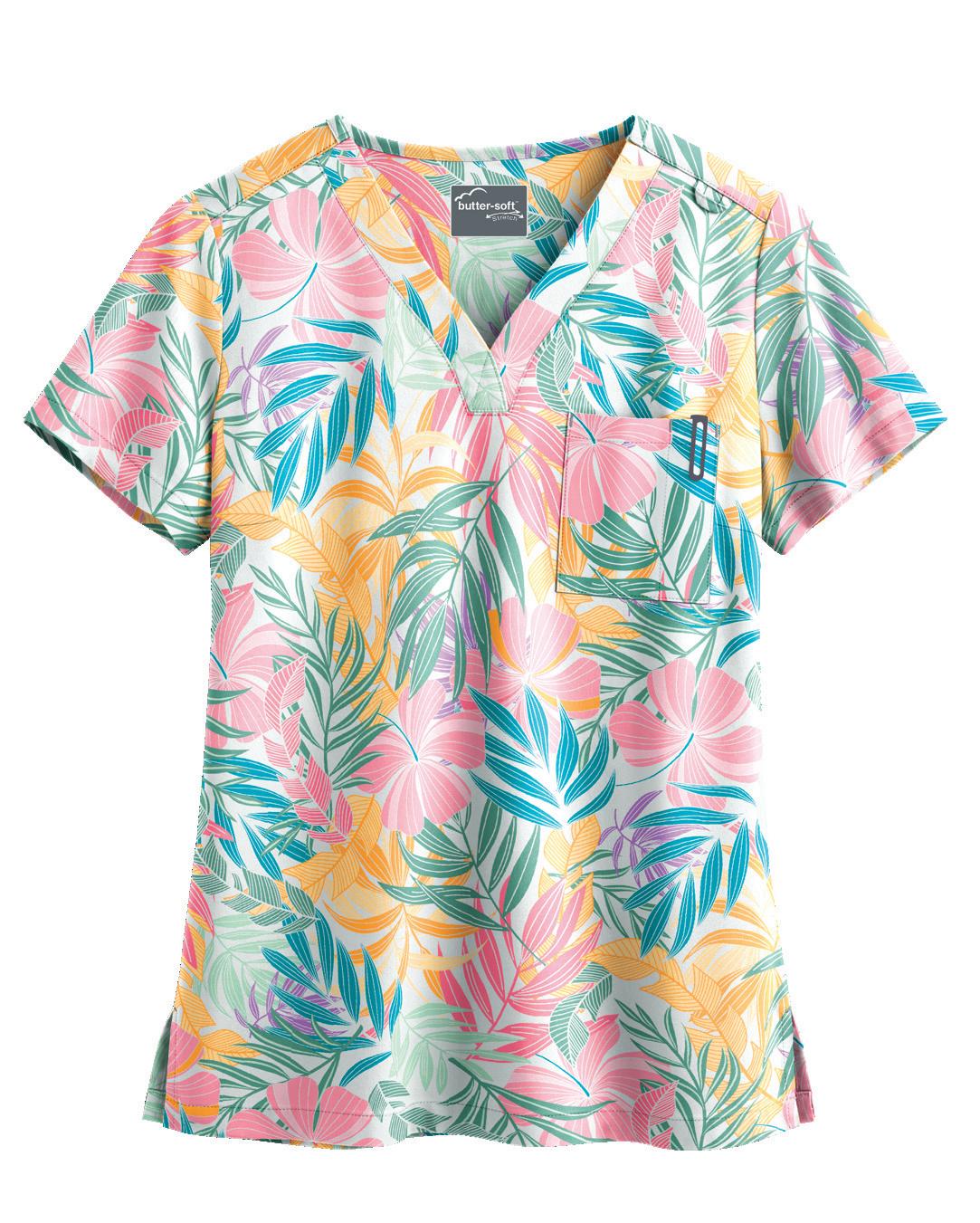 B. TROPICAL MIX WHITE TOP SALE Modern fit, 1 pocket, V-neck, tuck-in, back darts, bust darts, ID loop. Coordinates with Guava Fizz, Apricot Sunset, Orchid, Eucalyptus Leaf, Water Mint, Teal, and White. TS452 TMWT X XS-5X $22.99-$27.99 XXS-XL $18.39 , 2X-3X $20.79, 4X-5X $22.39
