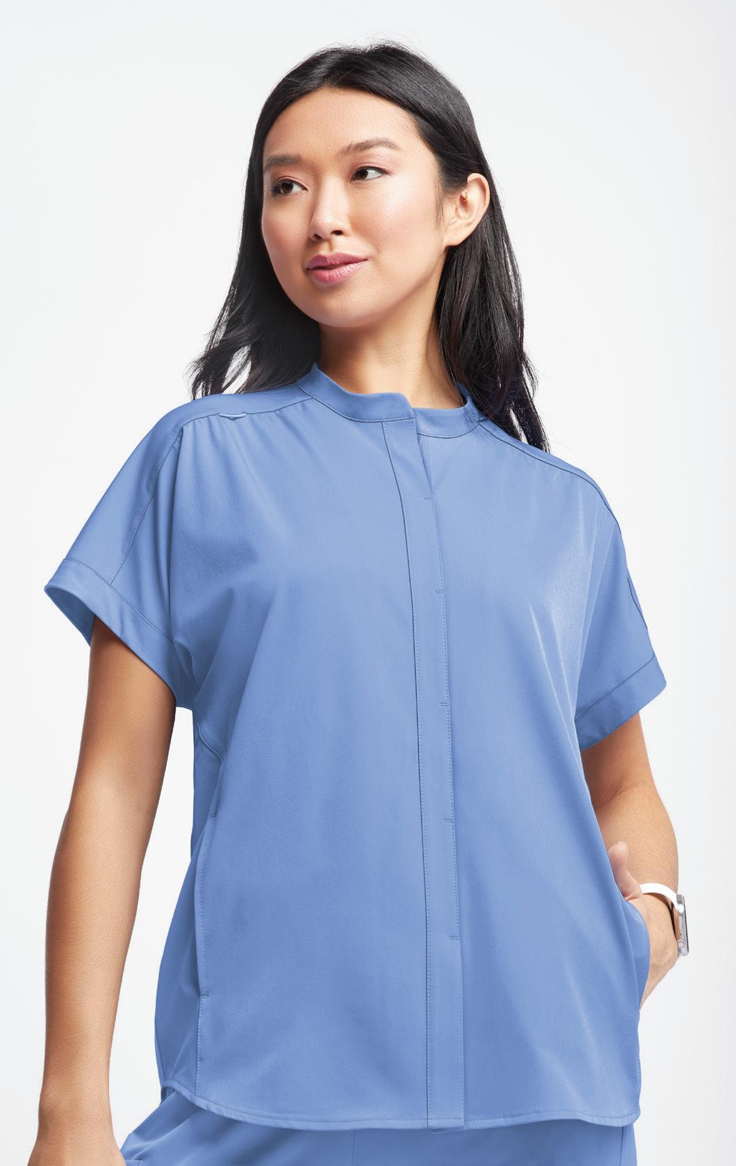 D. LARGE GROMMET TOP SALE V-neck, silver nickel grommets, back darts and side vents, 4 pockets. Shown in Eucalyptus Leaf. See colors below. BSS 754 XS-3X $22.99-$25.99 XS-XL $16.09 , 2X-3X $18.19