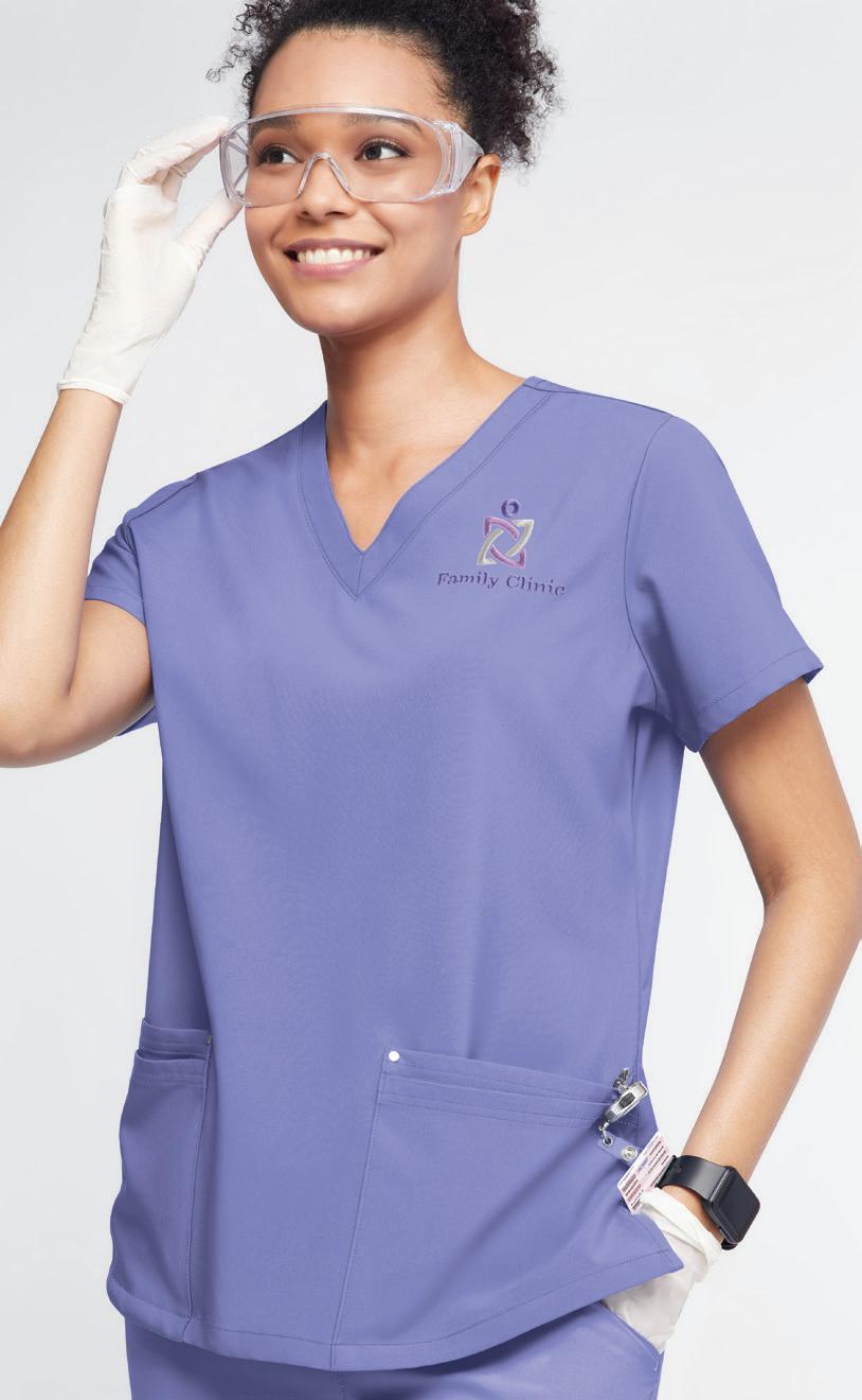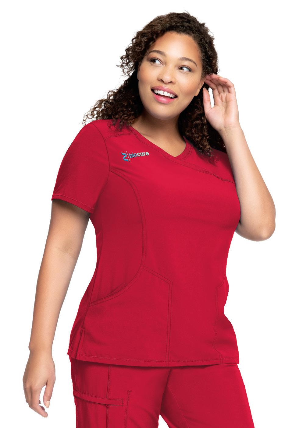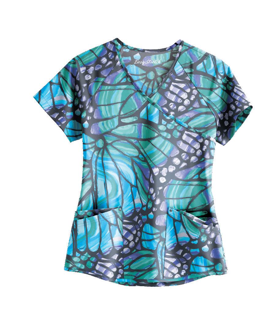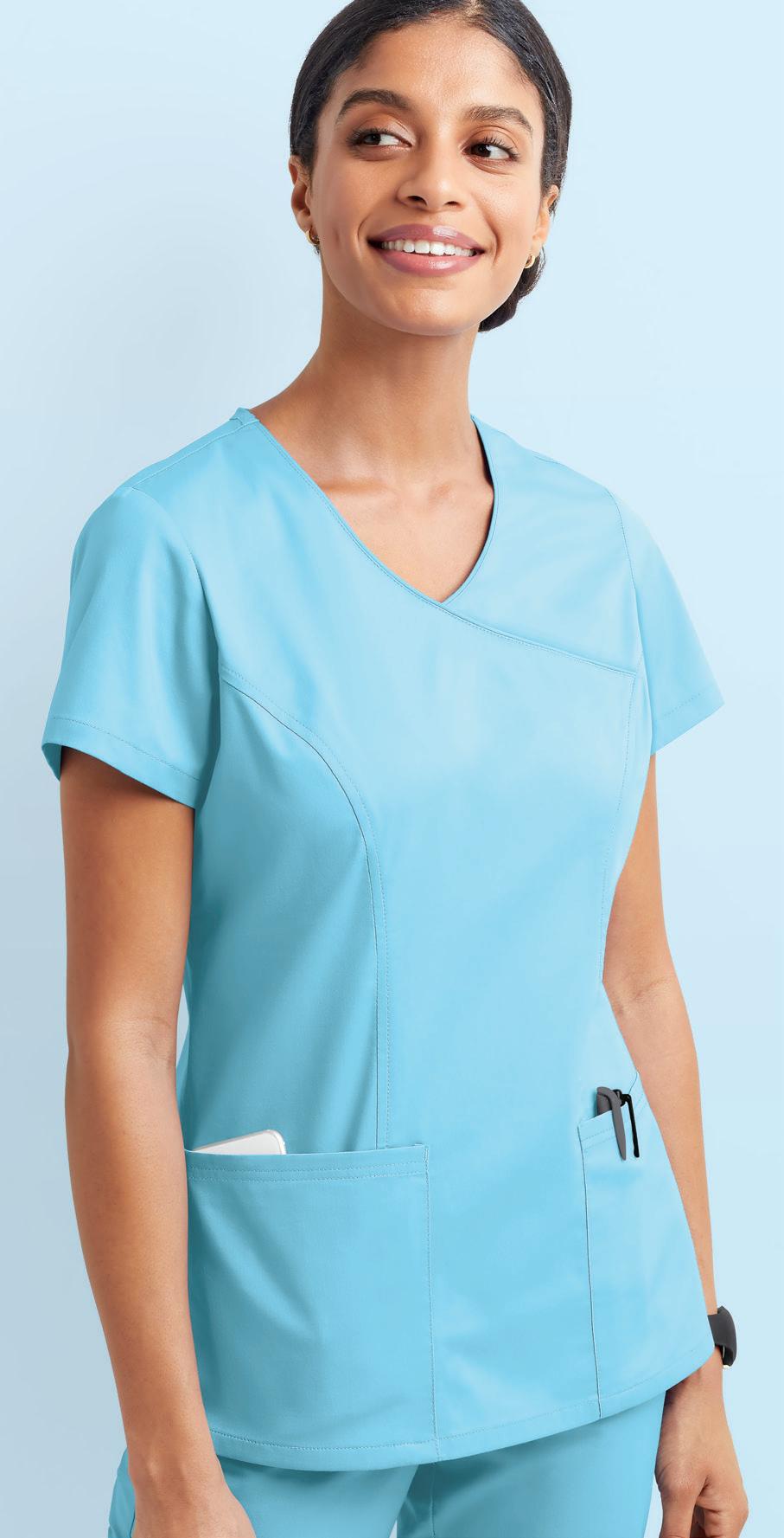 E. V-NECK MOCK WRAP TOP SALE Princess seams, 3 pockets, back darts, and side vents. Shown in Poolside View. See colors below. BSS 929 XS-3X $22.99-$25.99 XS-XL $17.24 , 2X-3X $19.49