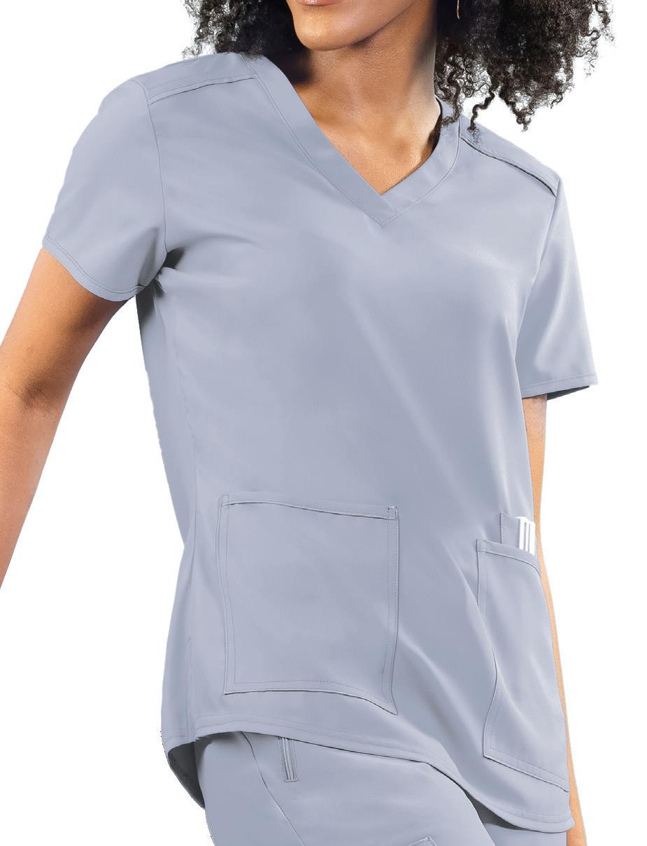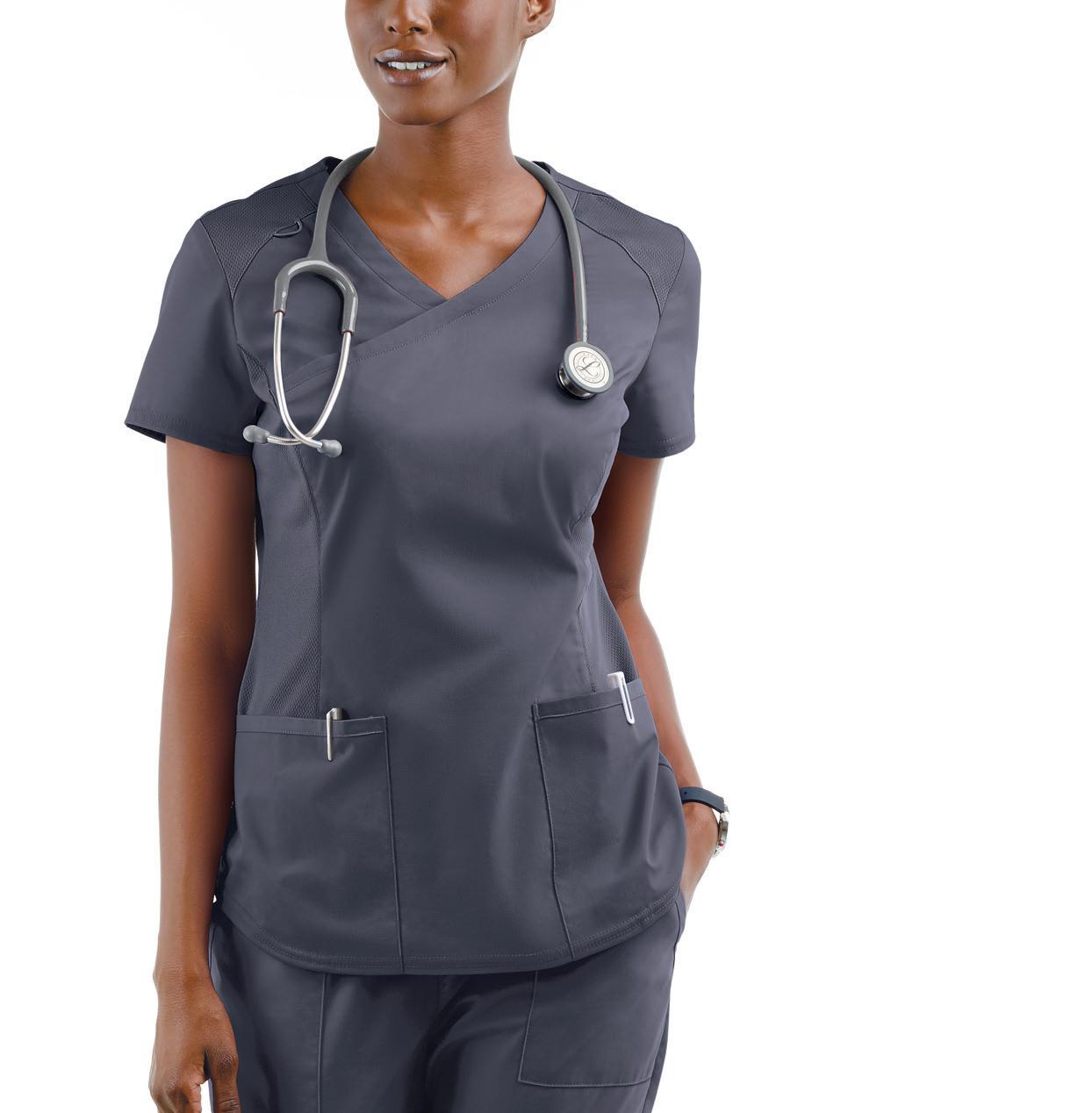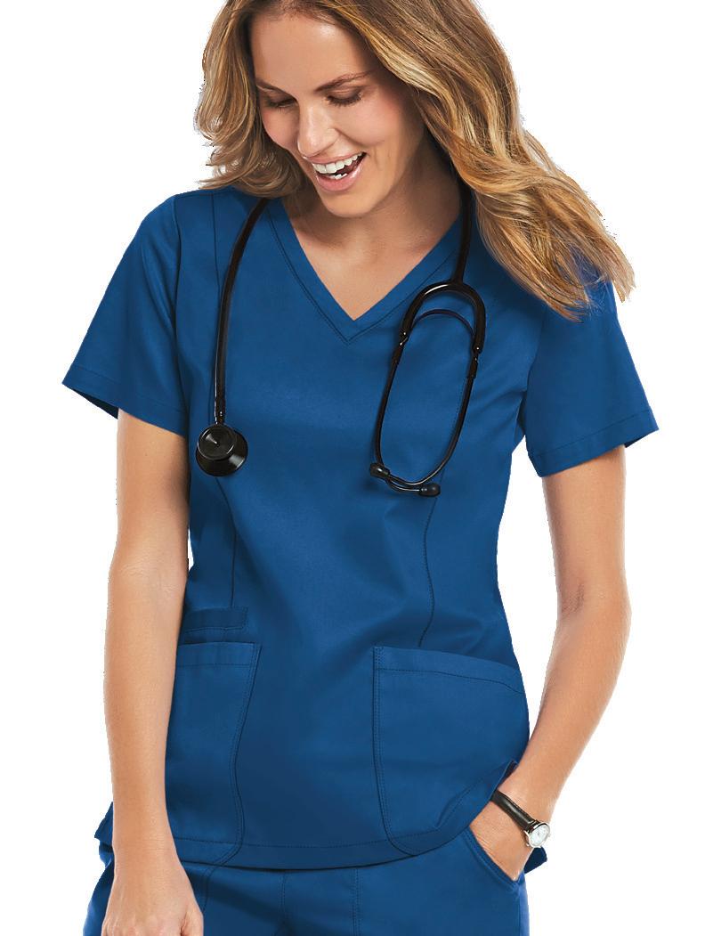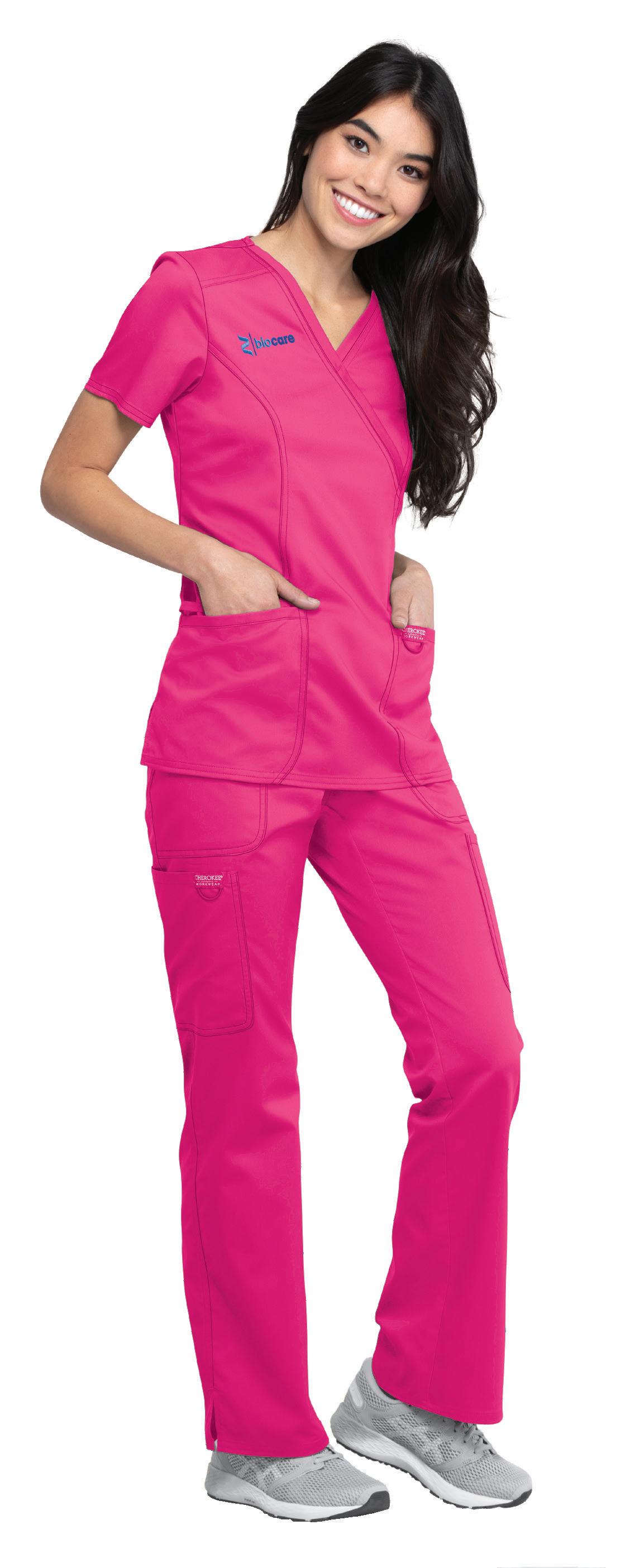 E. V-NECK MOCK WRAP TOP SALE Princess seams, 3 pockets, back darts, and side vents. Shown in Poolside View. See colors below. BSS 929 XS-3X $22.99-$25.99 XS-XL $17.24 , 2X-3X $19.49
