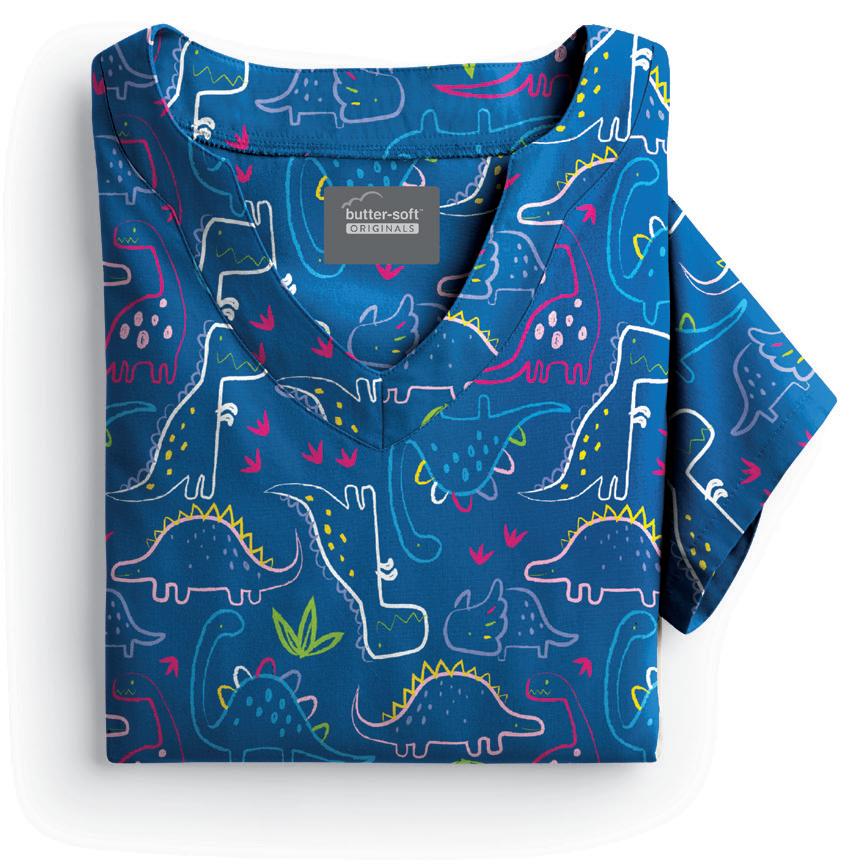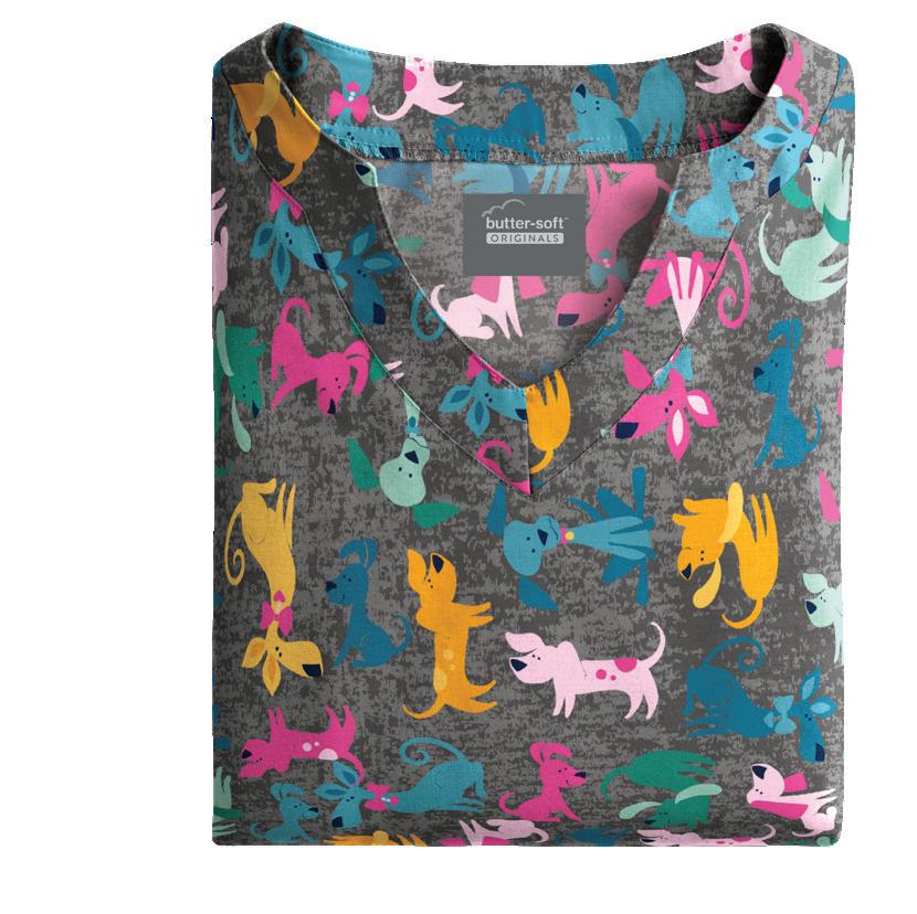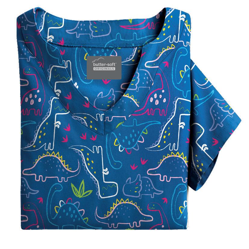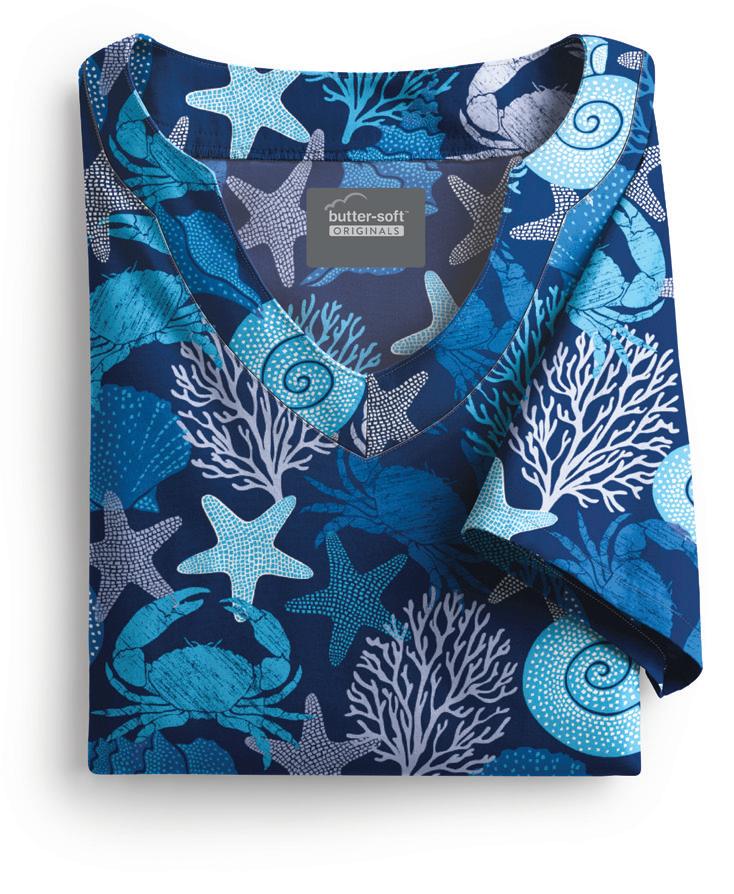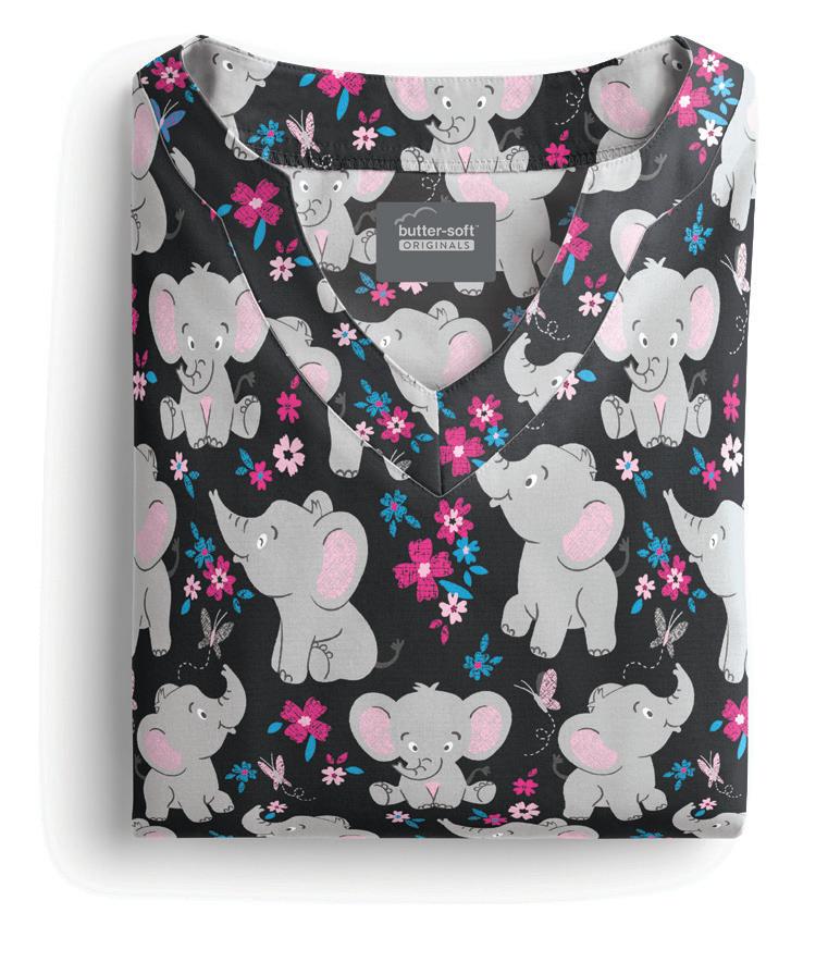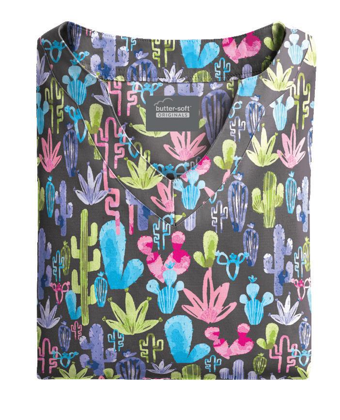 Butter-Soft Stretch solids are cotton/poly/spandex and Butter-Soft Stretch prints are poly/spandex. Length for Medium tops is 27-28”