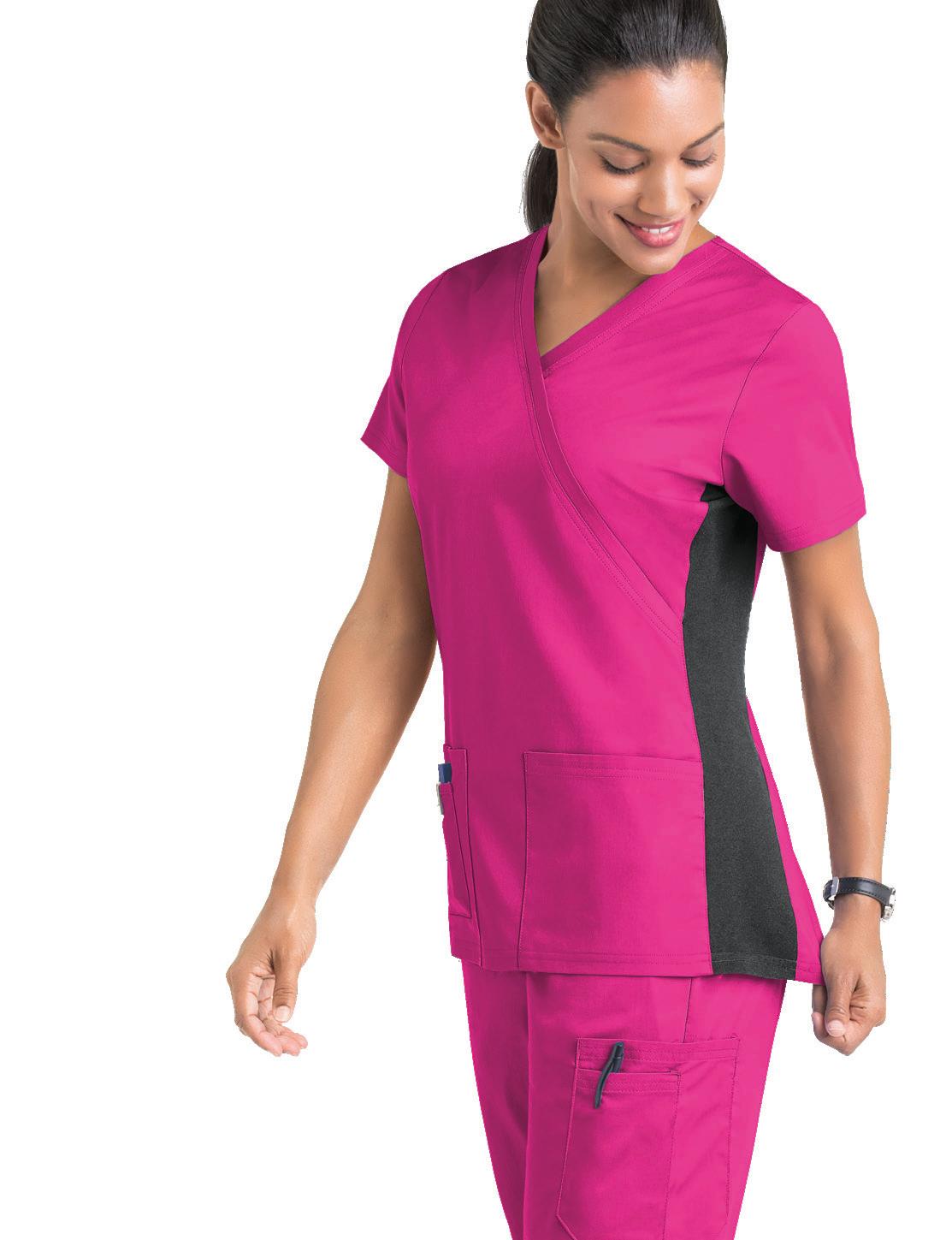 C. MOCK WRAP TOP WITH KNIT PANELS SALE 3 pockets, knit side panels. Knit is poly/spandex. Shown in Fuchsia/Black. See contrast colors left and solid colors below. BSSN 948 XS-3X $24.99-$27.99 XS-XL $17.49 , 2X-3X $19.59