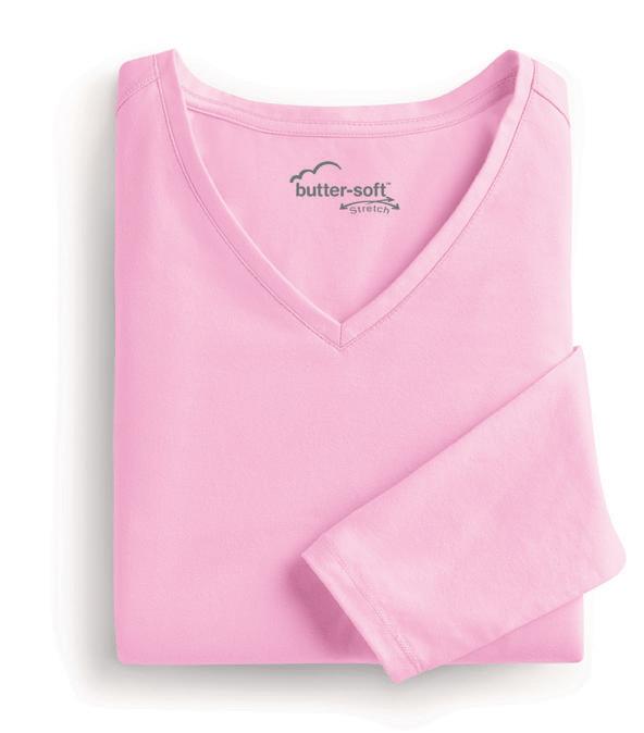 Butter-Soft Stretch solids are cotton/poly/spandex. Length for Medium tops is 27-28”.
