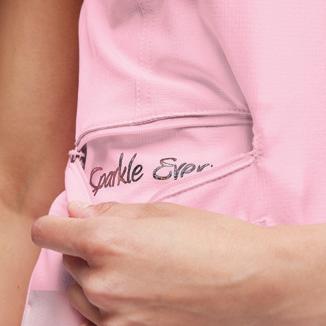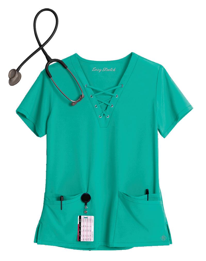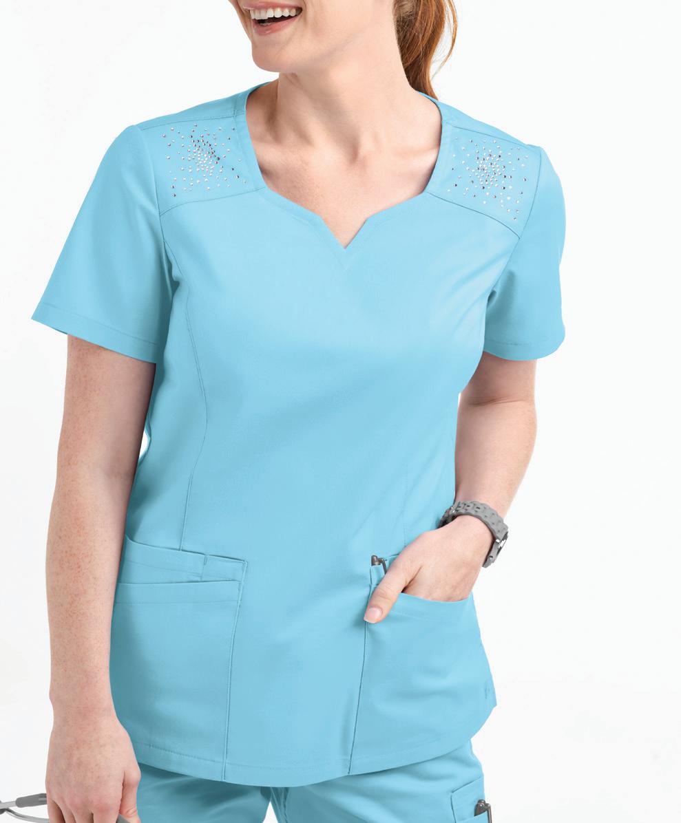 F. NEW 6-POCKET CRYSTAL BLING TOP SALE Sweetheart neck, 4 angled front pockets, 2 pen pockets. Princess seams, back yoke, side vents. Shown in Eucalyptus Leaf. See colors below.