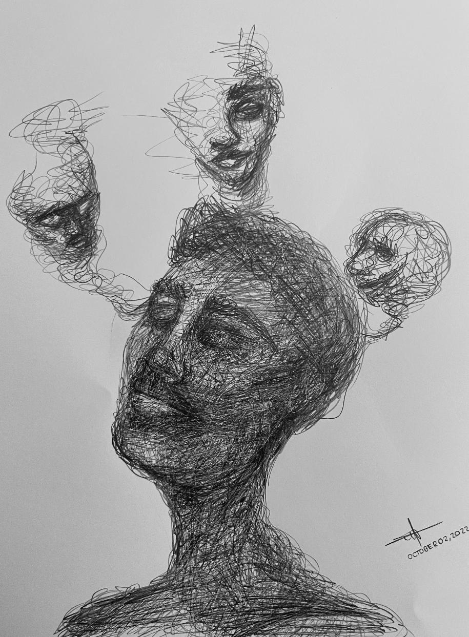 Las tres mini cabezas que sobresalen de la principal, denotan y transmiten ideas diferentes; La primera, denota FRUSTRACIÓN. Debido a la intensidad de los trazos y el gesto del rostro, la segunda denota ESTRÉS; Debido a los gestos de desespero del rostro, y por último, la tercera cabeza denota SARCASMO; Debido a la sonrisa sarcástica del dibujo y la posición del cráneo como tal.