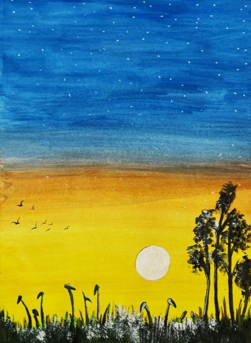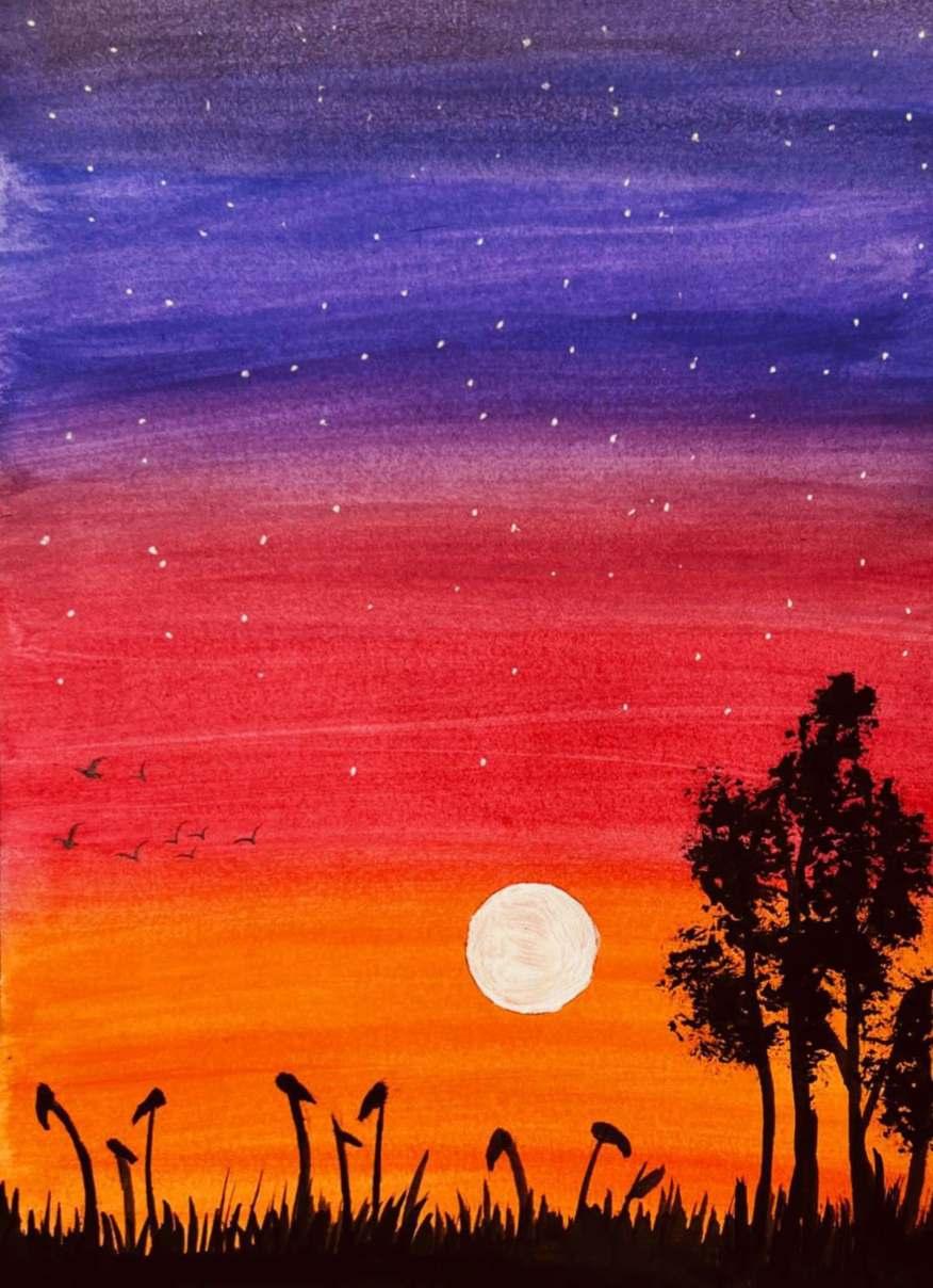 No cabe duda de que, incluso más allá de las fronteras de la religión, la nacionalidad y el idioma, la magia del atardecer puede ser disfrutada por todos por igual. No es de extrañar que la puesta del sol encierre un gran simbolismo, por no hablar de los colores que salpican el lienzo del cielo durante este acontecimientos. Y es que, quise transmitir una puesta de sol, la cual, básicamente brinda una sensación de paz y serenidad que puede ser tan difícil de encontrar en la agitada vida actual. Las puestas de sol pueden enseñar a encontrar el valor en las pequeñas cosas y que la vida está llena de bellos momentos en medio de todos los cambios. Fue complicado transmitir una obra con acuarela que represente una forma de relajarse después de un largo día, meditar, planificar objetivos y aspiraciones futuras, o para simplemente pensar.