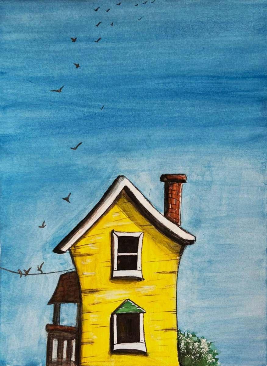 Esta obra, quiso transmitir algo simple, nada rebuscado, sobre explotado, algo neutral que denoté emociones simples de tranquilidad, paz, paciencia y soledad. La soledad, puede llegar a hacernos sentir pequeños e i nsignificantes, pero a la vez, i ndependientes y fuertes. Por eso, traté de acentuar el color amarillo en la casa como tal, ya que está relacionado con la alegría, la originalidad, la inteligencia. En un tono pálido, representa enfermedad, envidia, celos, deterioro, preocupación.